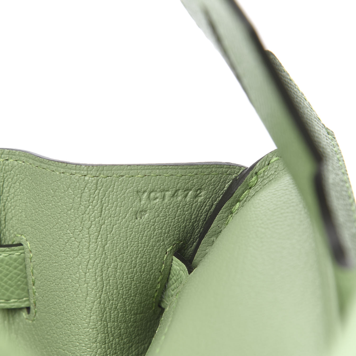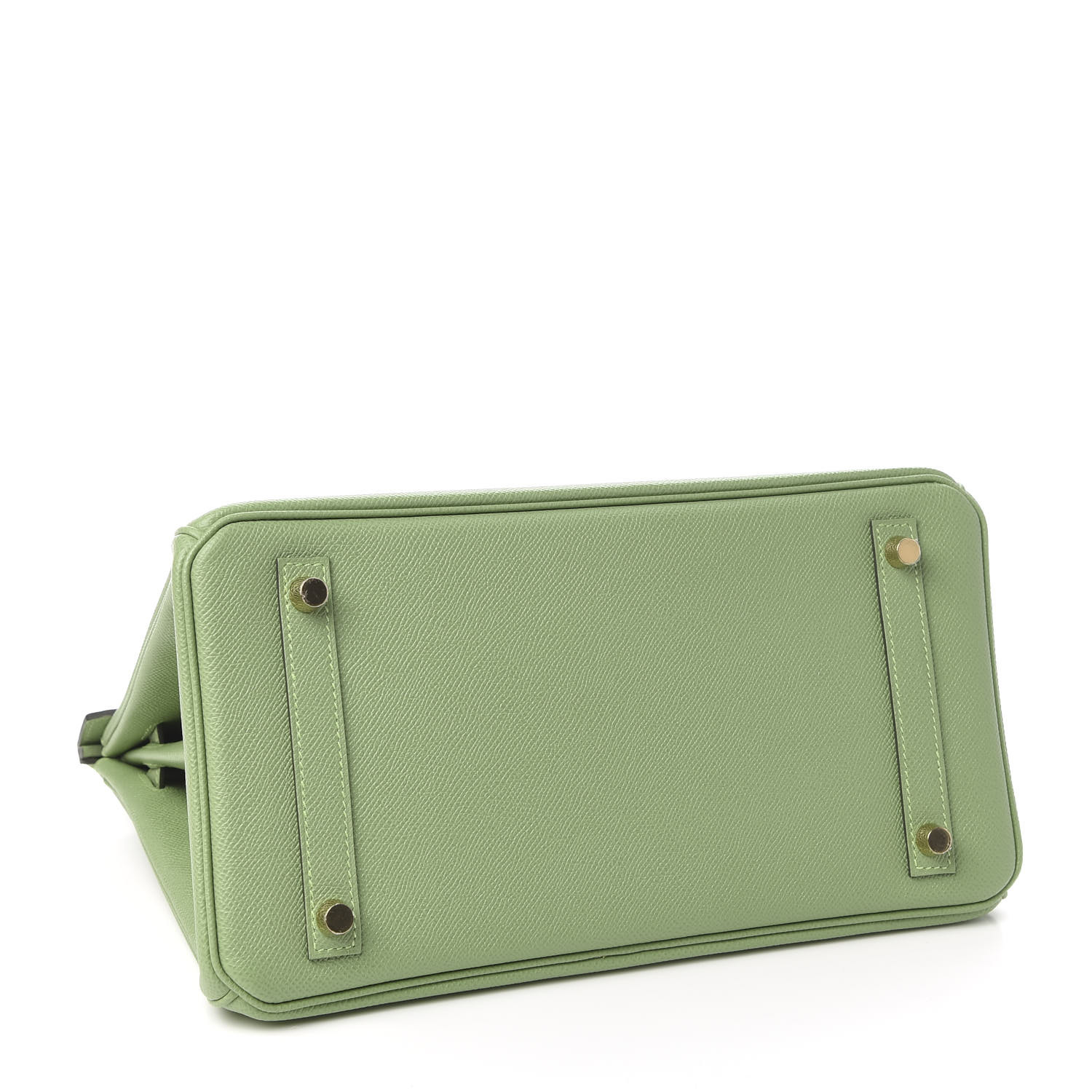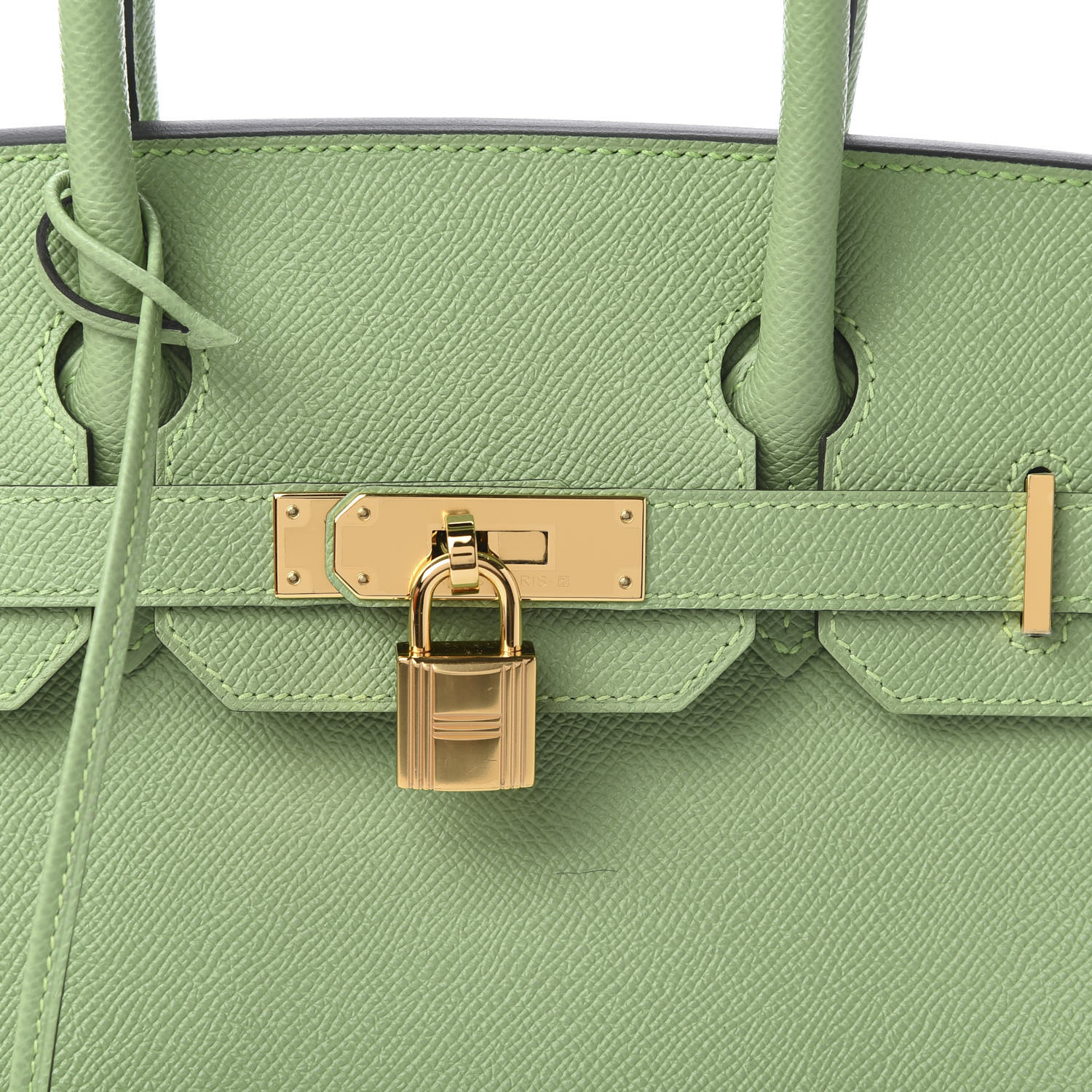 This stylish Birkin handbag is crafted of luxurious calfskin leather in a vibrant shade of green. This features looping leather top handles, a short front flap with a strap closure and a gold plated turn lock, padlock, and a hanging clochette with keys. The flap opens to a matte goatskin leather interior with zipper and patch pockets. This is an excellent handbag for every occasion, from Hermes!