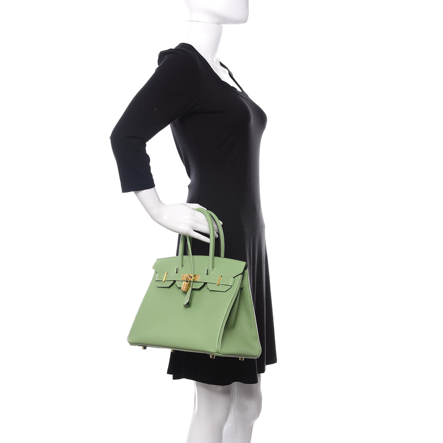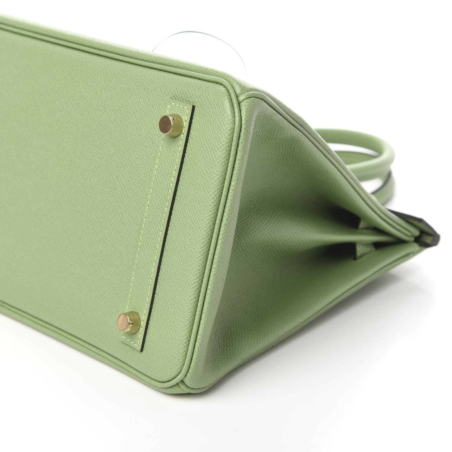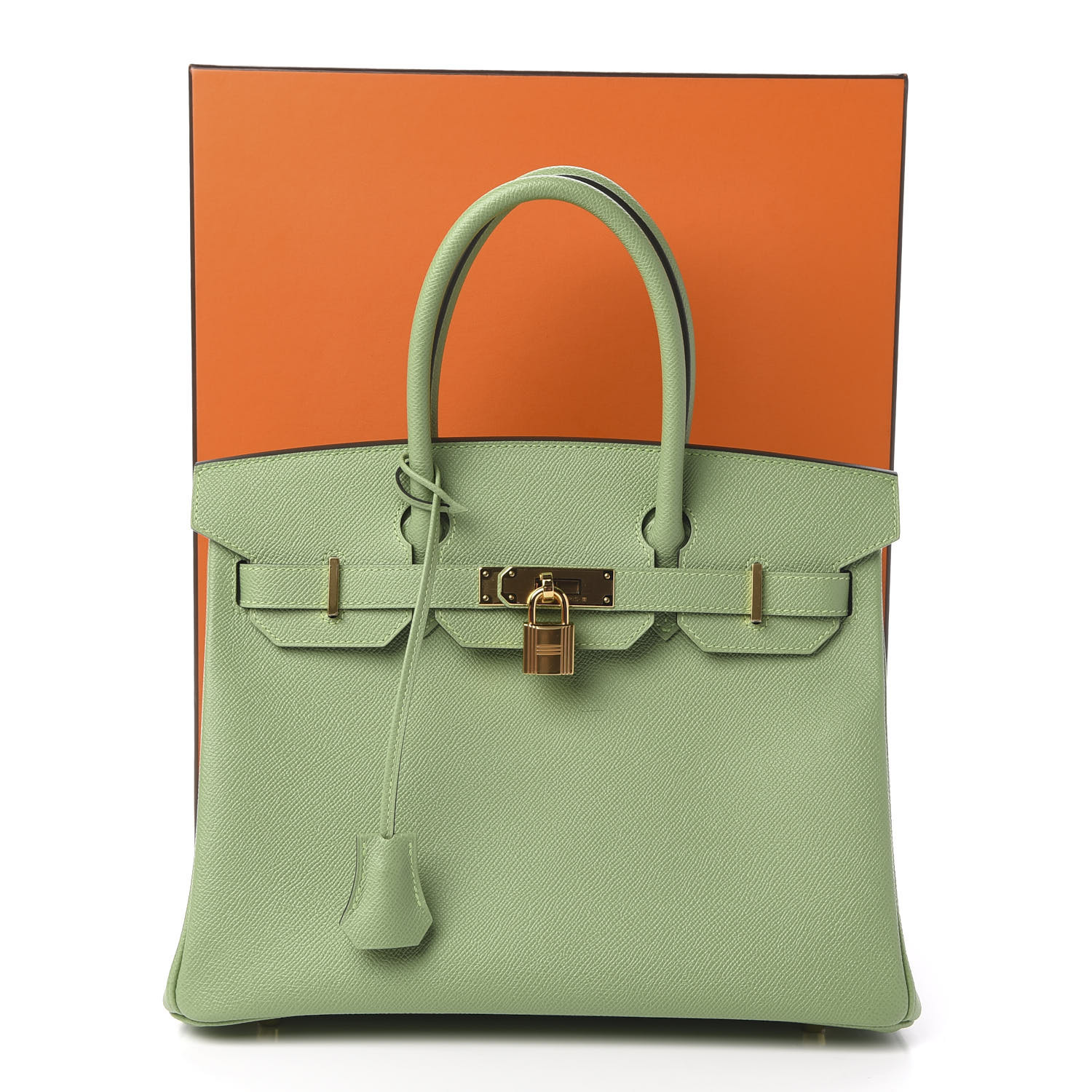 This stylish Birkin handbag is crafted of luxurious calfskin leather in a vibrant shade of green. This features looping leather top handles, a short front flap with a strap closure and a gold plated turn lock, padlock, and a hanging clochette with keys. The flap opens to a matte goatskin leather interior with zipper and patch pockets. This is an excellent handbag for every occasion, from Hermes!