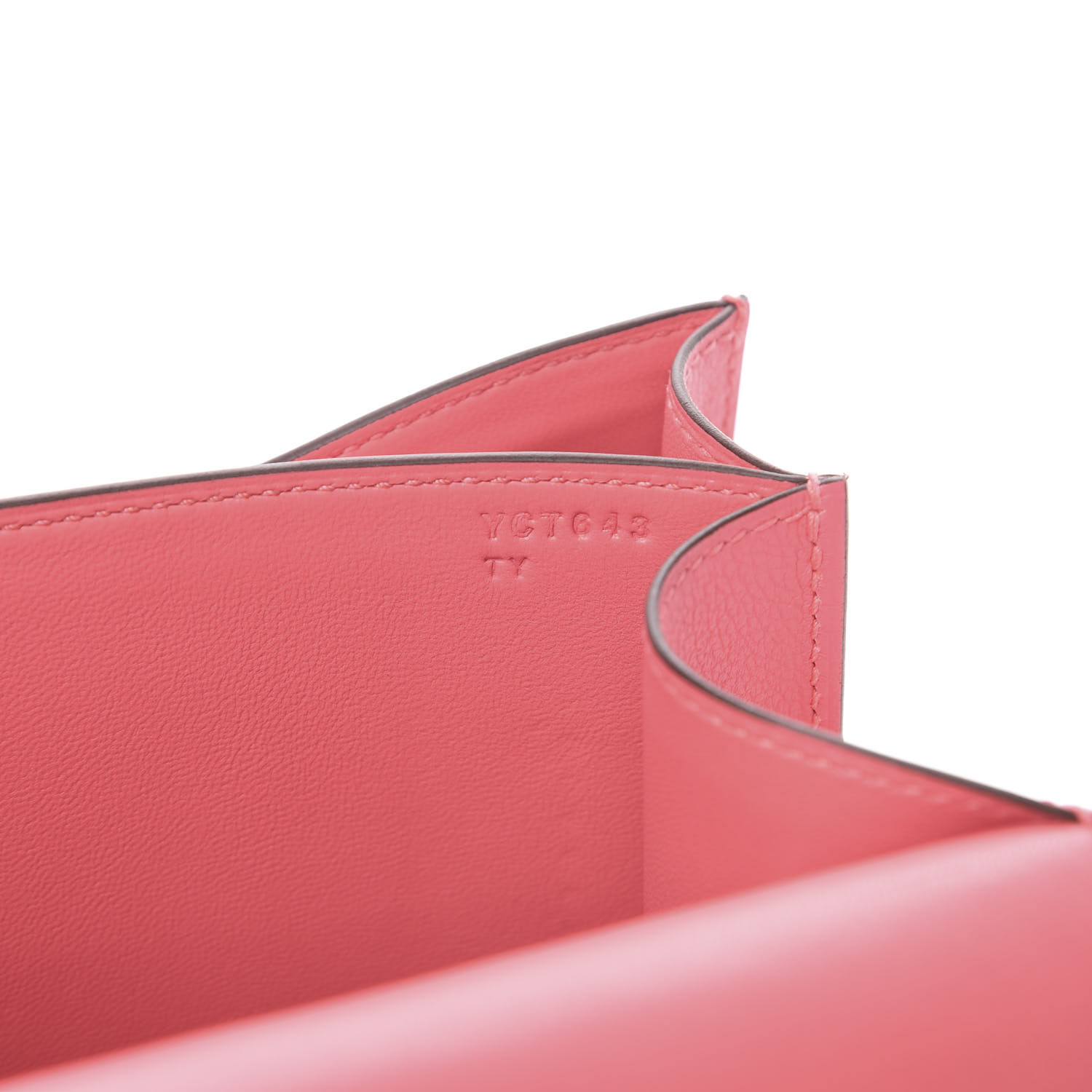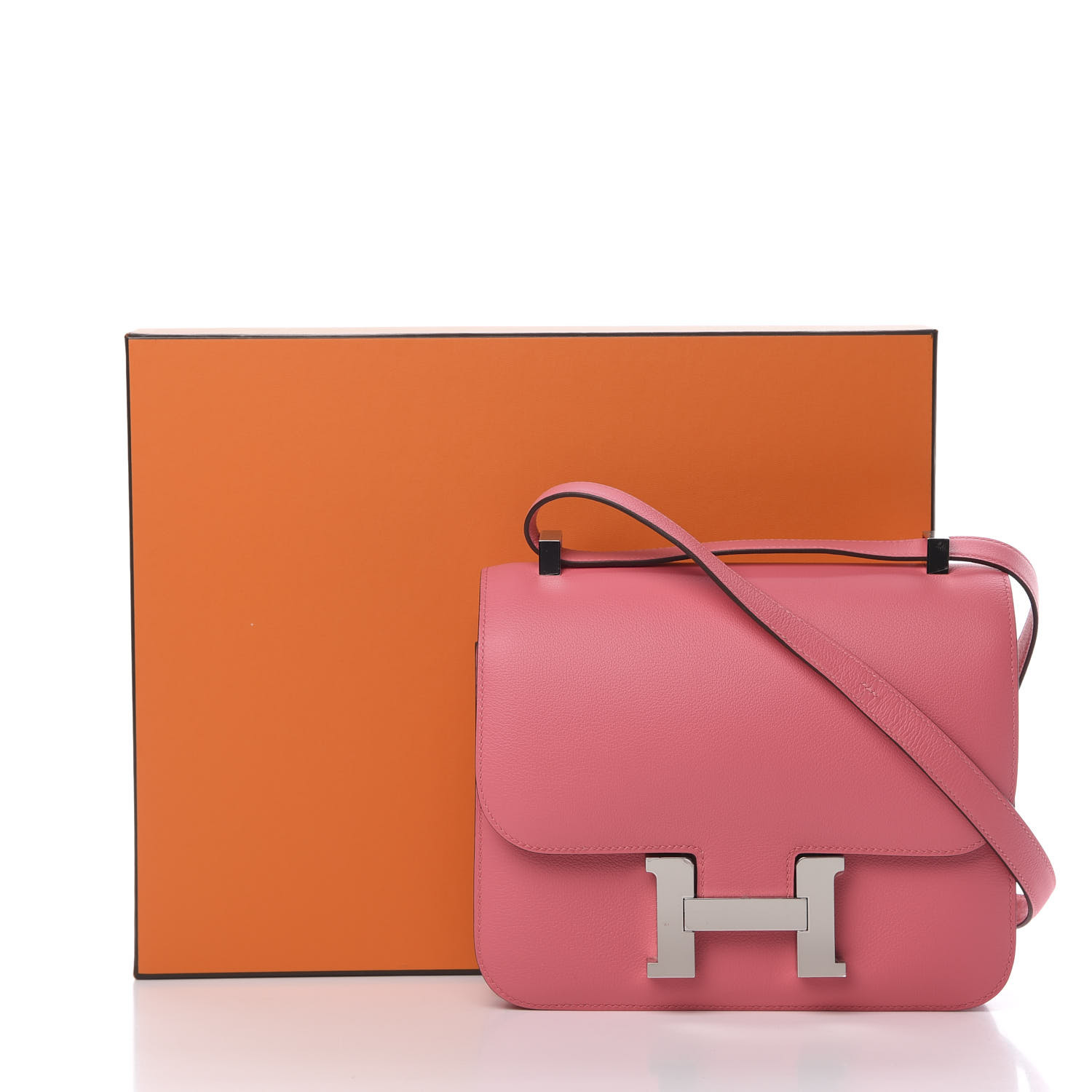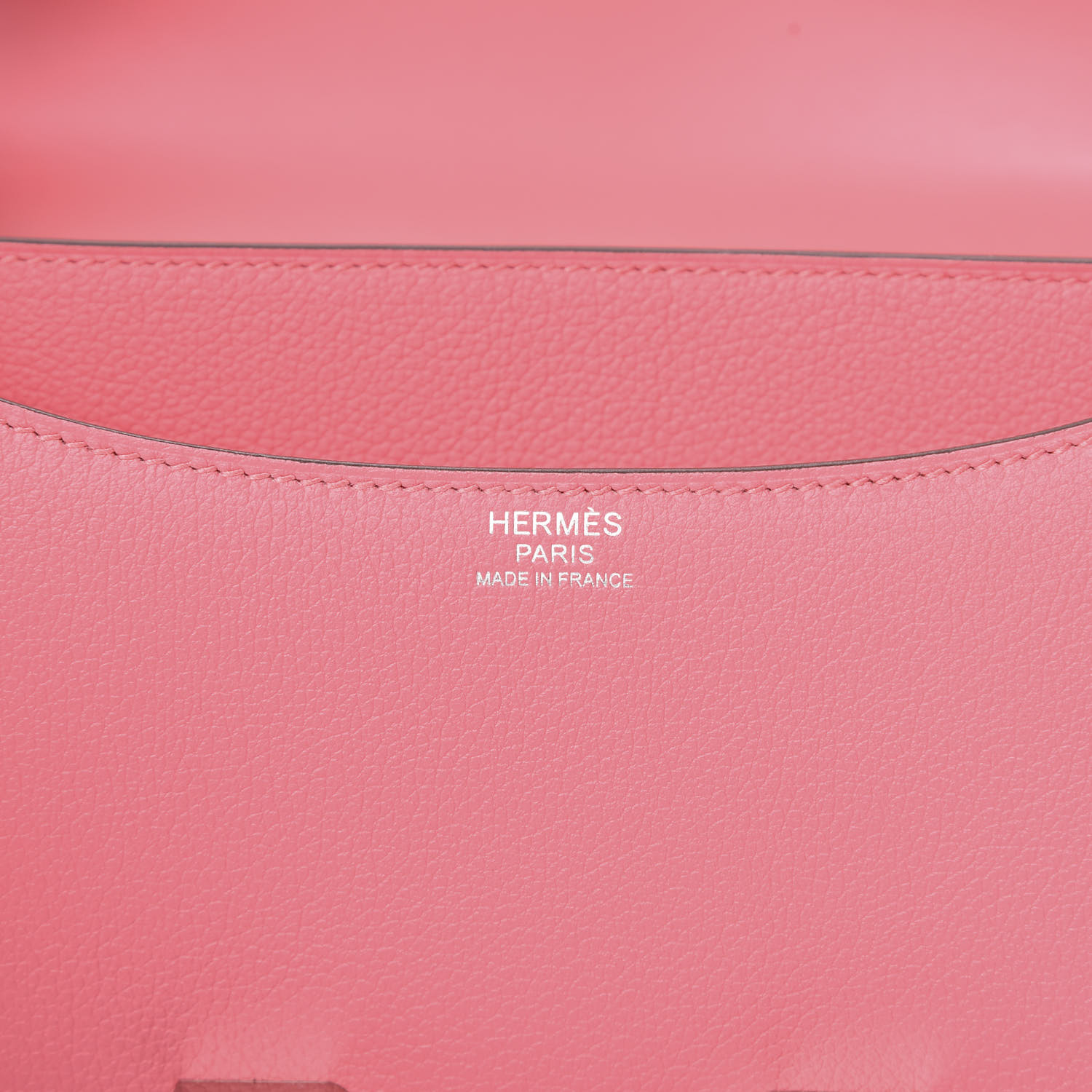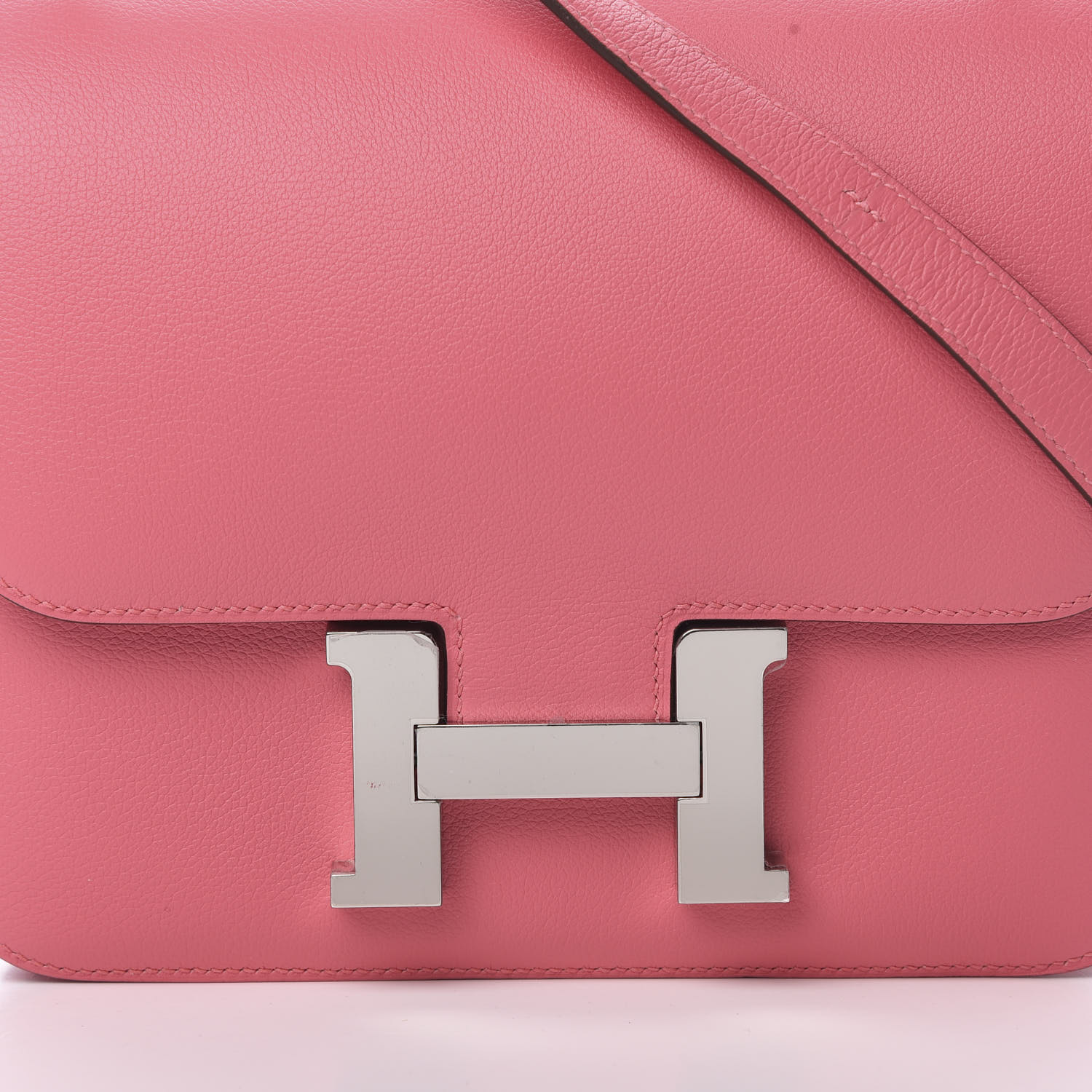This stylish shoulder bag is crafted of fine textured evercolor leather in bright pink. This chic bag features a uniquely constructed looping shoulder strap with polished palladium links and a top flap that tucks into a prominent H in palladium hardware. This opens to a partitioned lambskin leather interior with a zipper and patch pocket. This is an excellent shoulder bag, ideal for everyday wear, from Hermes!