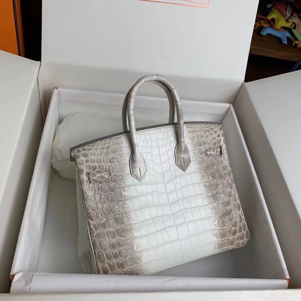 Equally iconic and elusive, the Himalaya Birkin is an exquisite piece of fashion art history. Created from a backdrop of freshwater niloticus crocodile skin, this rare Birkin has been expertly tanned and dyed to attain beautiful contrast shading. Hand-sewn stitching has been applied by a technique passed down through the centuries to an expert Hermes craftsman. Palladium plated hardware with protective stickers intact is found at the straps as well as the base feet. Included are two keys and a crocodile-wrapped cadena lock. This perfectly sized Birkin features a roomy interior lined in gray goatskin leather, and features both zippered and flat pockets. Additional items included are the CITES certificate, a protective rain jacket, dustbags and an Hermes protective storage box. Please contact our Client Services personnel to inquire about purchasing, and to learn more about our white glove service for this exclusive item.