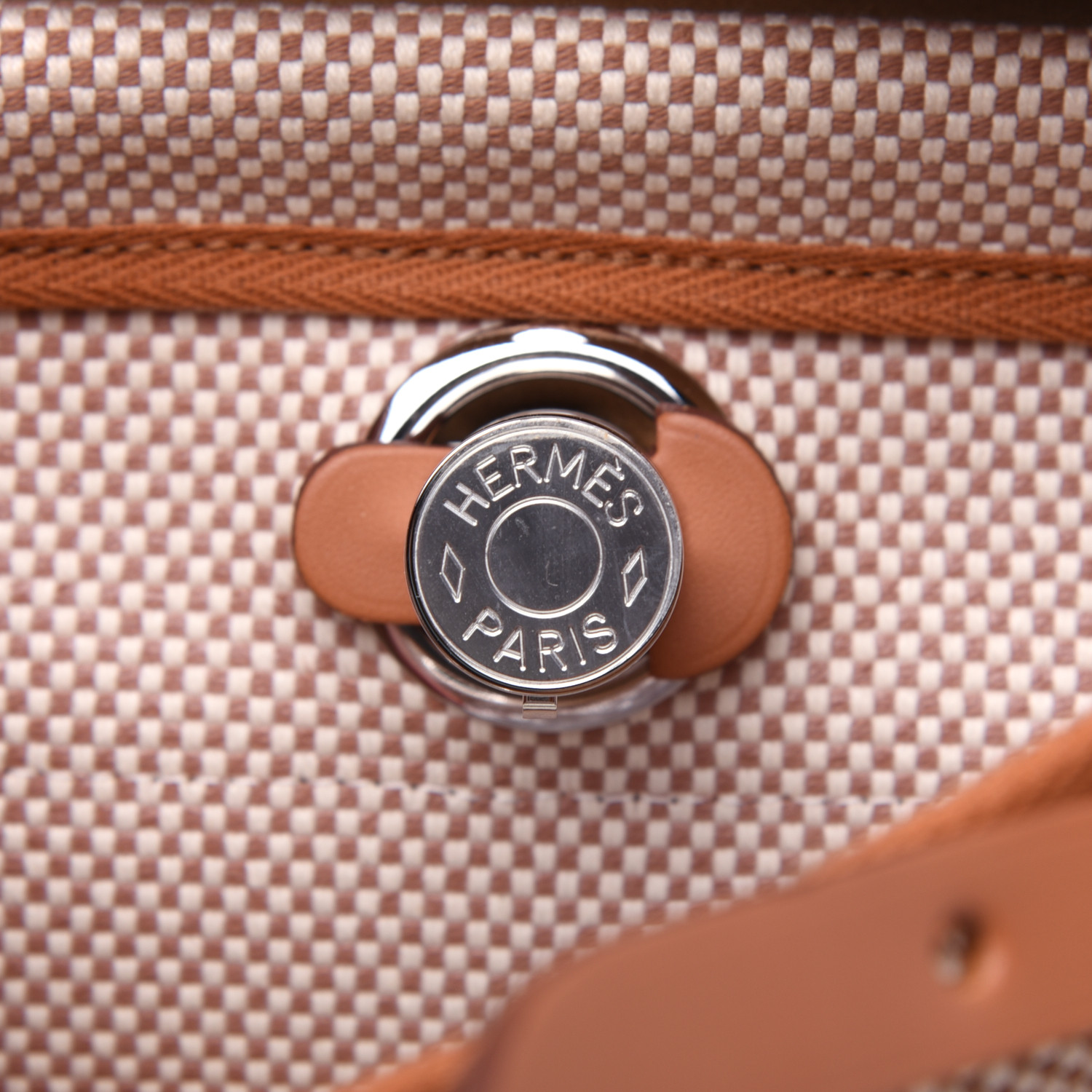 This stylish tote is crafted of sturdy toile canvas in beige with a printed beige and white checkered pattern. The handbag features a rear exterior zip pocket, a brown leather top crest with a leather top handle, shoulder strap, and strap closure with palladium silver hardware with a padlock. This opens to a toile canvas interior with a matching removable pouch. This is a perfect tote for everyday use, from Hermes!.jpg)
