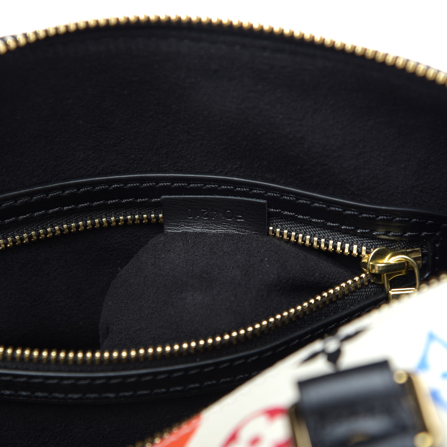 This classic shoulder bag is crafted of Louis Vuitton monogram on coated canvas in white with red hearts and multicolor monograms. It features black calfskin leather rolled top handles, an optional, adjustable shoulder strap, and gold hardware. The top opens with a zipper to a black fabric interior with a pocket and plenty of room for everyday necessities by Louis Vuitton!