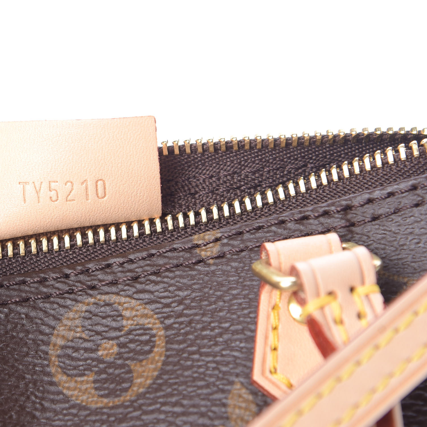 This stylish, petite tote is crafted of Louis Vuitton monogram on toile canvas. The shoulder bag features vachetta cowhide rolled leather top handles with small polished brass links and a vachetta leather cross body shoulder strap. The top zipper opens to a cocoa fabric interior..jpg)