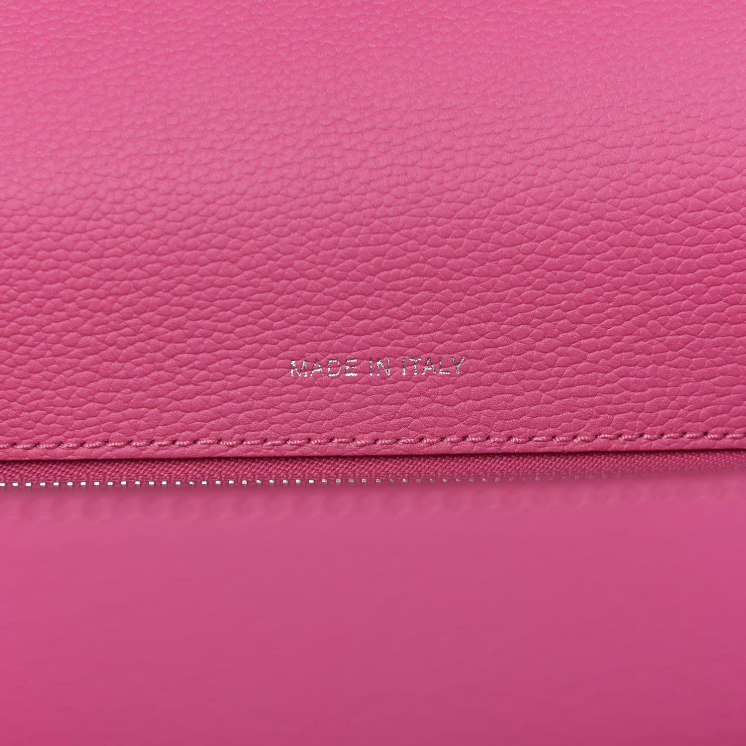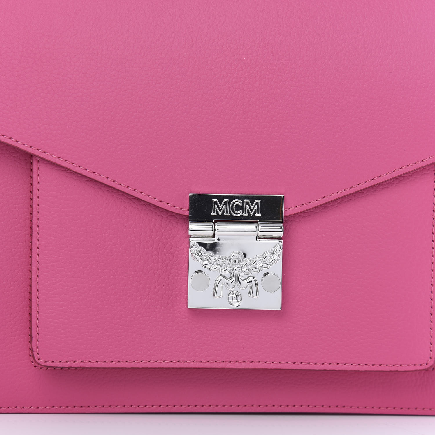 This chic handbag is finely crafted of pebbled pink leather and features a leather handle and an optional adjustable leather shoulder strap. It has a front patch pocket, and the V-shaped front flap with a polished silver press lock opens to a pink microfiber interior with a zipper and patched pocket. This is the perfect messenger bag for everyday essentials with style and luxury, from MCM!