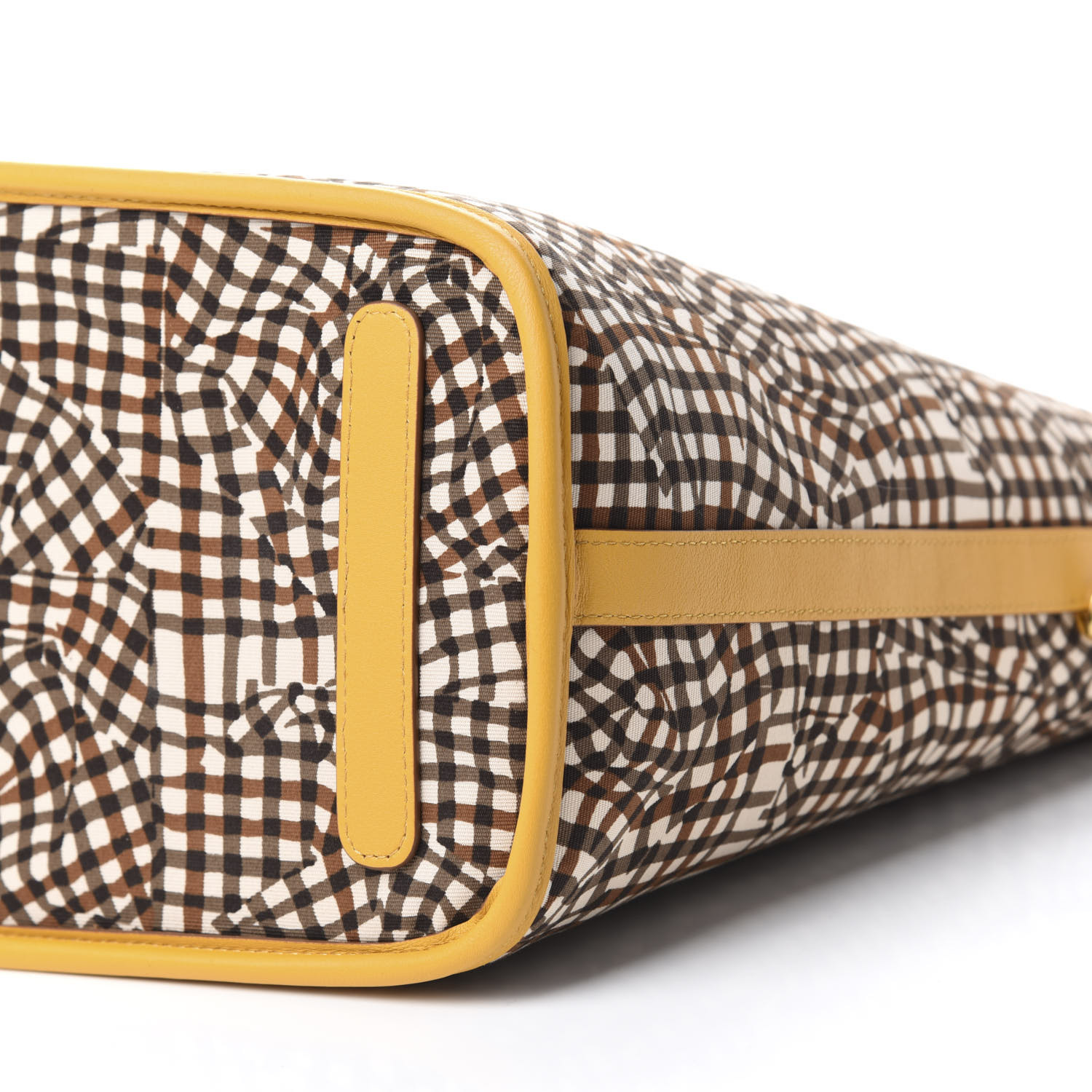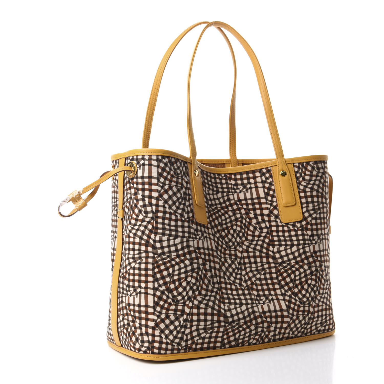 This reversible tote is finely crafted of classic MCM monogram in black on light brown Visetos coated canvas in light brown. The bag features yellow leather trim, shoulder straps, and side cinch cords with gold hardware. The top is open to a brown checkered fabric interior and a removable zipper pouch.