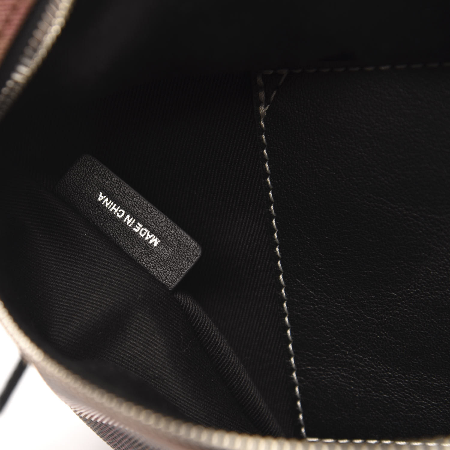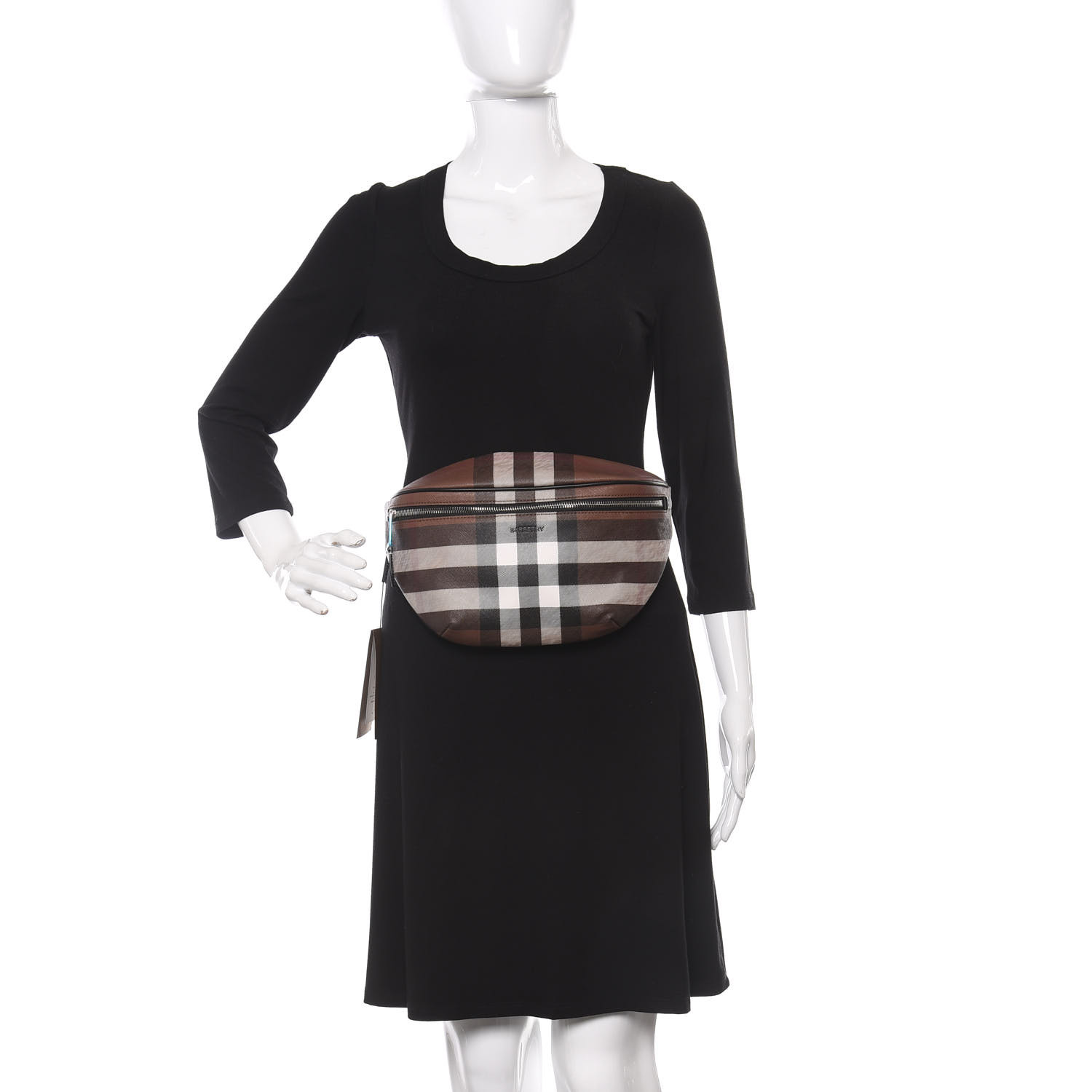 This stylish bag is crafted of a brown check coated canvas. The belt bag features black leather trim, an exterior zipper pocket, a black nylon belt, and silver hardware. The top zipper opens to a black fabric interior with a patch pocket..jpg)