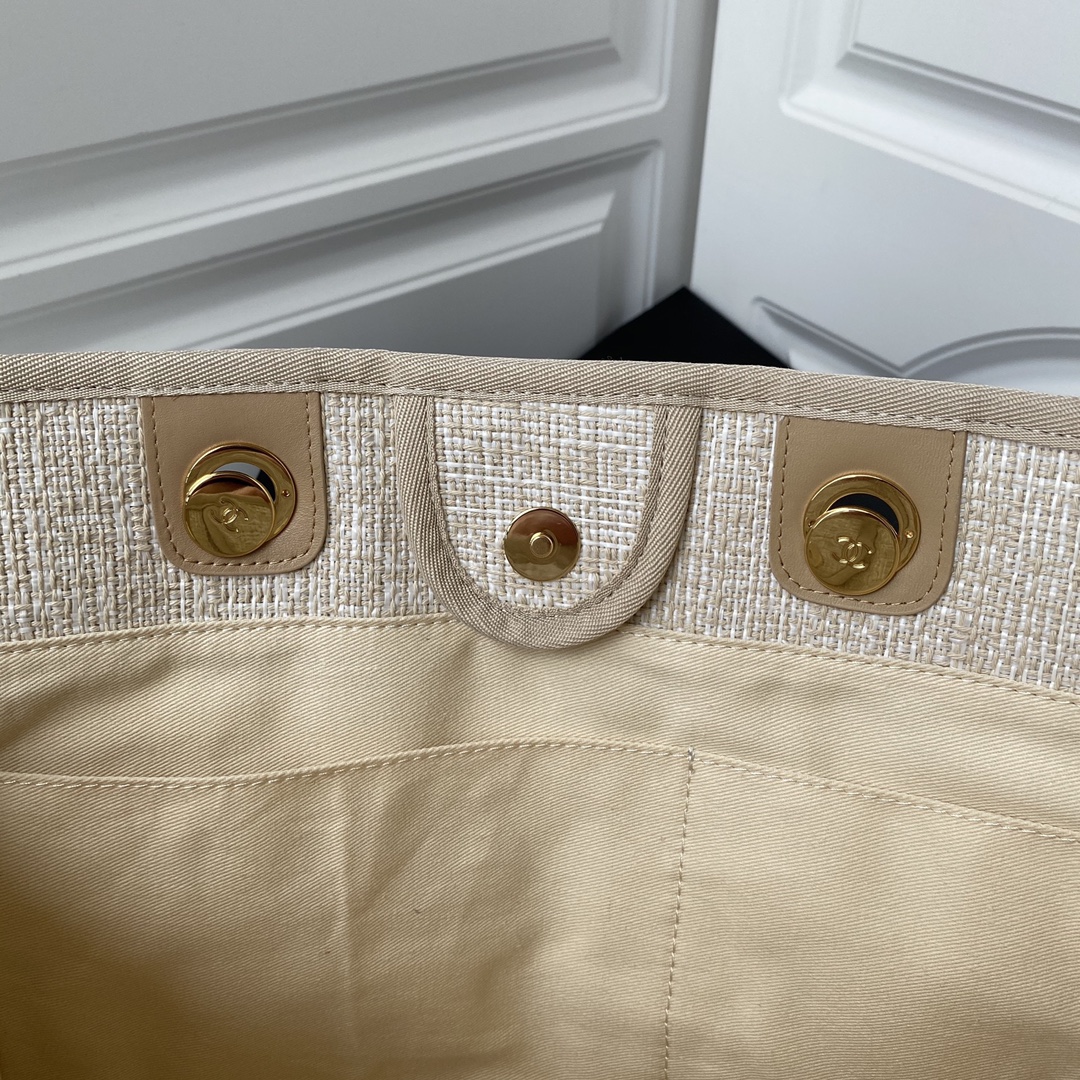 This stylish tote is crafted of fine canvas in light beige with a gold printed Chanel Rue Cambon Paris logo. It features rolled leather top handles and fabric threaded gold chain shoulder straps. The top is open to a tan fabric interior with zipper and patch pockets. This is a perfect everyday tote, from Chanel!
