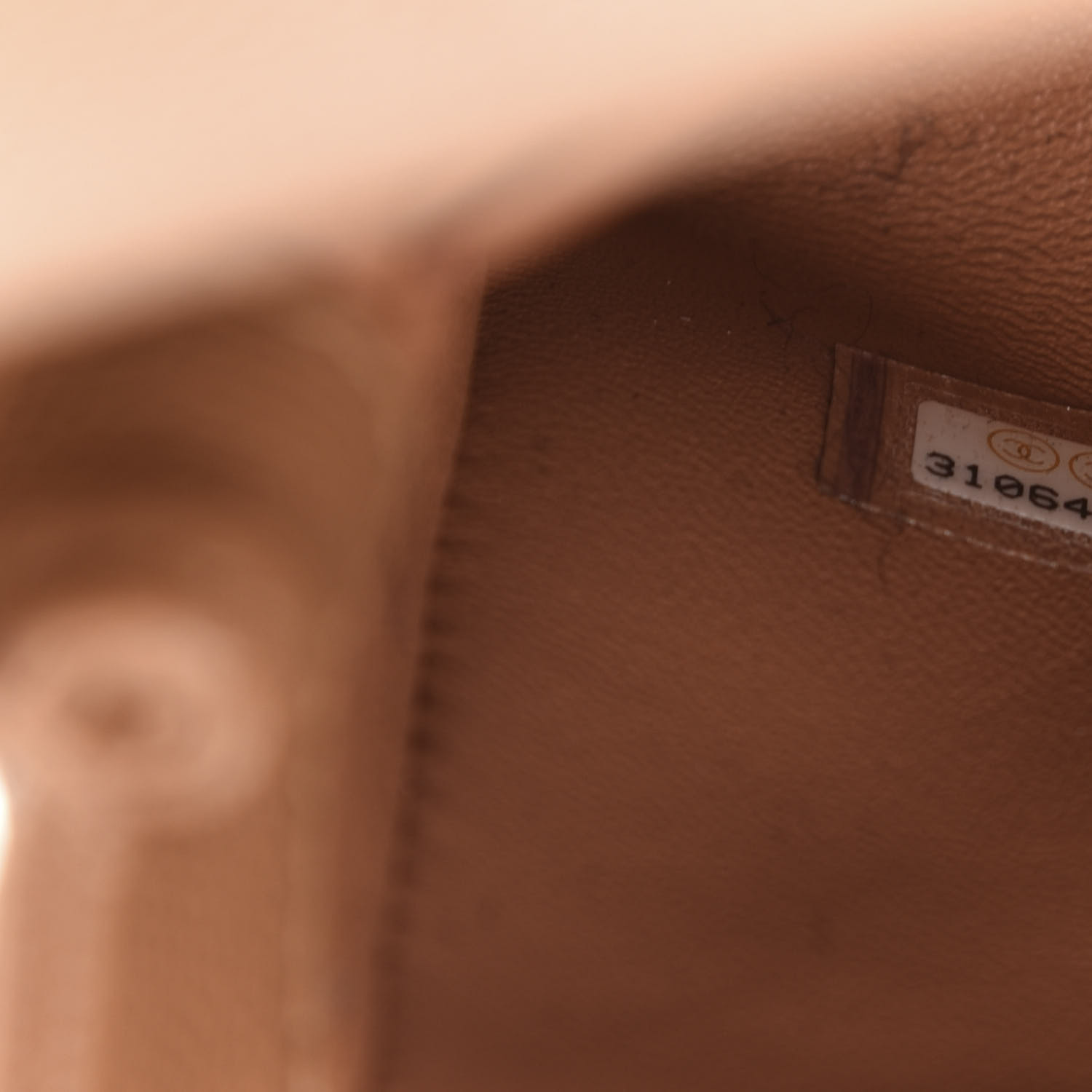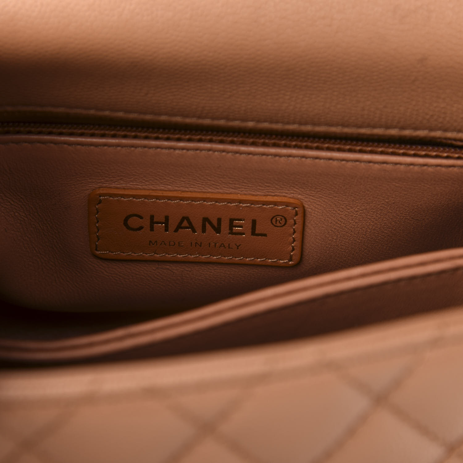 This chic tote is crafted of diamond-stitched grained calfskin leather in brown. The shoulder bag features a sturdy brown leather top handle, a thin aged gold chain-link leather threaded shoulder strap with a shoulder pad, a rear patch pocket, and an aged gold Chanel CC turn-lock closure. This opens the flap to a partitioned brown leather interior with zipper and patch pockets..jpg)