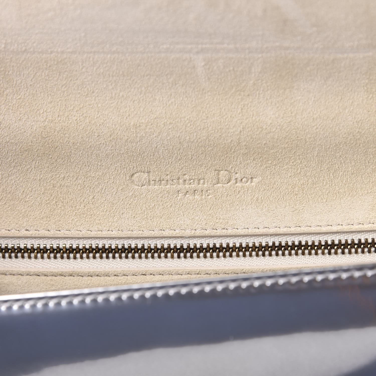 This ultra chic shoulder bag is crafted in smooth metallic leather in silver with a large sized geometric ribbing embellished with gold studs. The bag features an aged gold chain link adjustable waist length shoulder strap than can be doubled or worn long to be a cross body, a press lock and a facing flap. This opens to a beige interior for just the essentials for day or evening wear, from Christian Dior!.jpg)