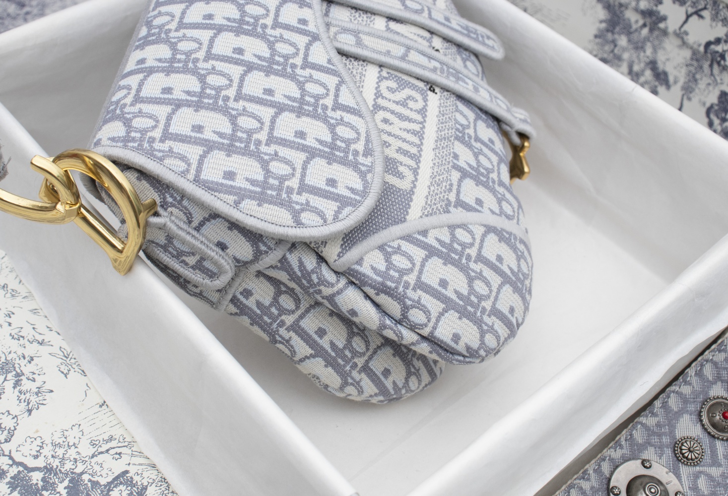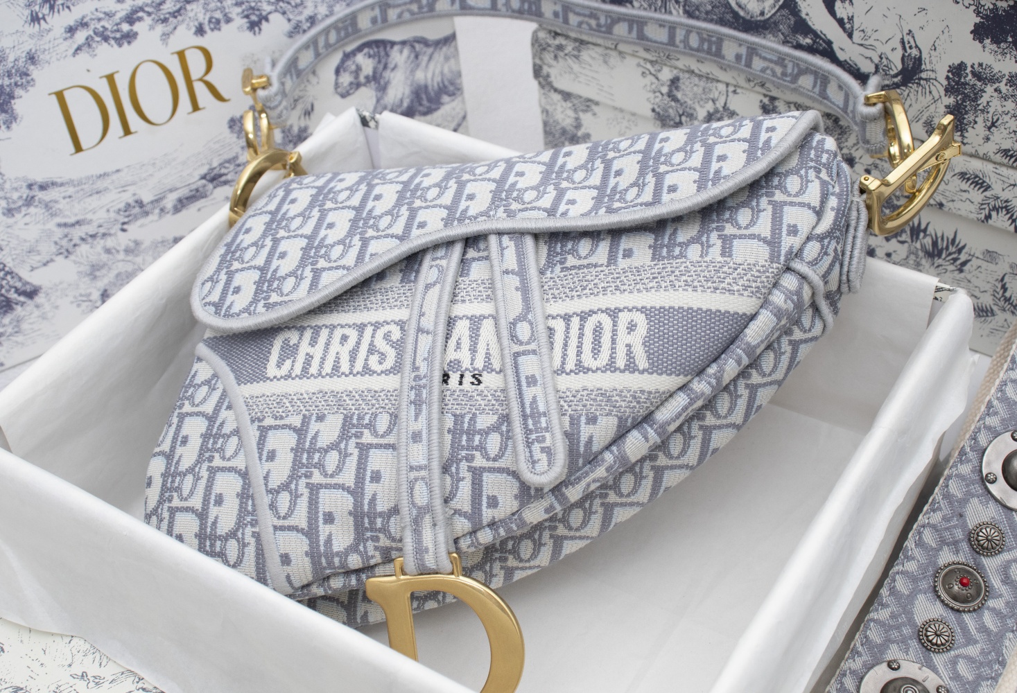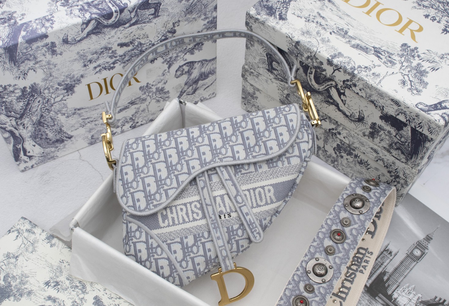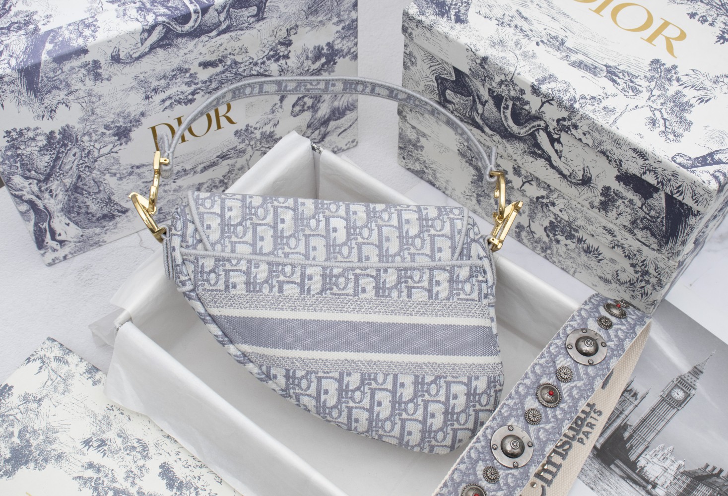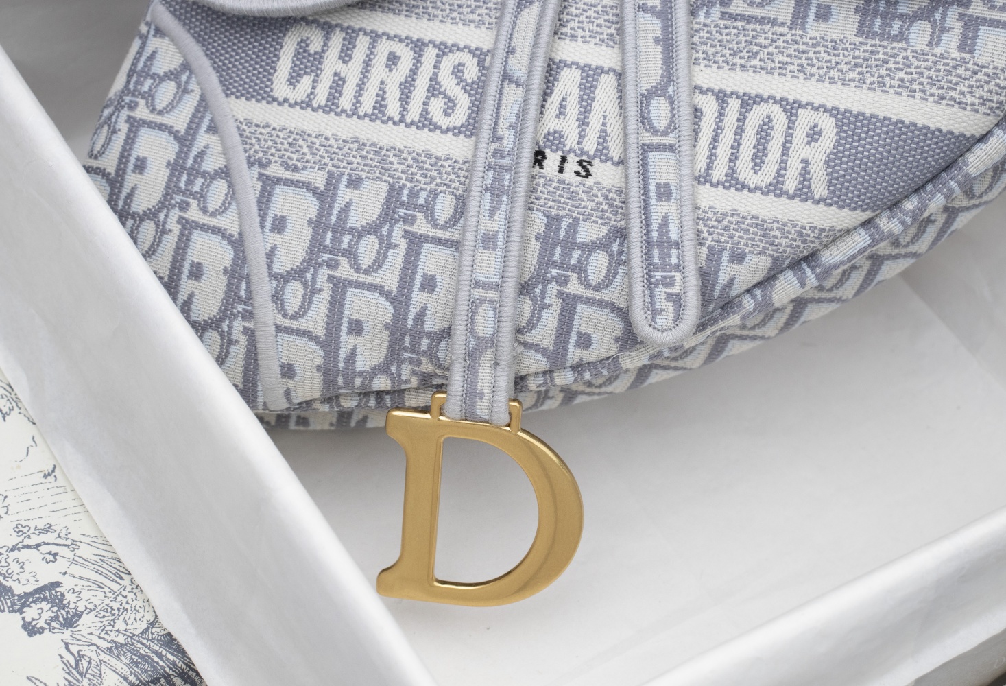 Maria Grazia Chiuri revisits the iconic Saddle bag and makes it an essential accessory. This model is highlighted by its magnetic "D" stirrup clasp and saddle-shaped flap, and by its "CD" signature on the handle which modernizes its silhouette. Crafted in Dior Oblique embroidered canvas and enhanced with aged gold-tone metallic pieces, it can also be worn with one of the season's new embroidered shoulder straps for a charismatic look.