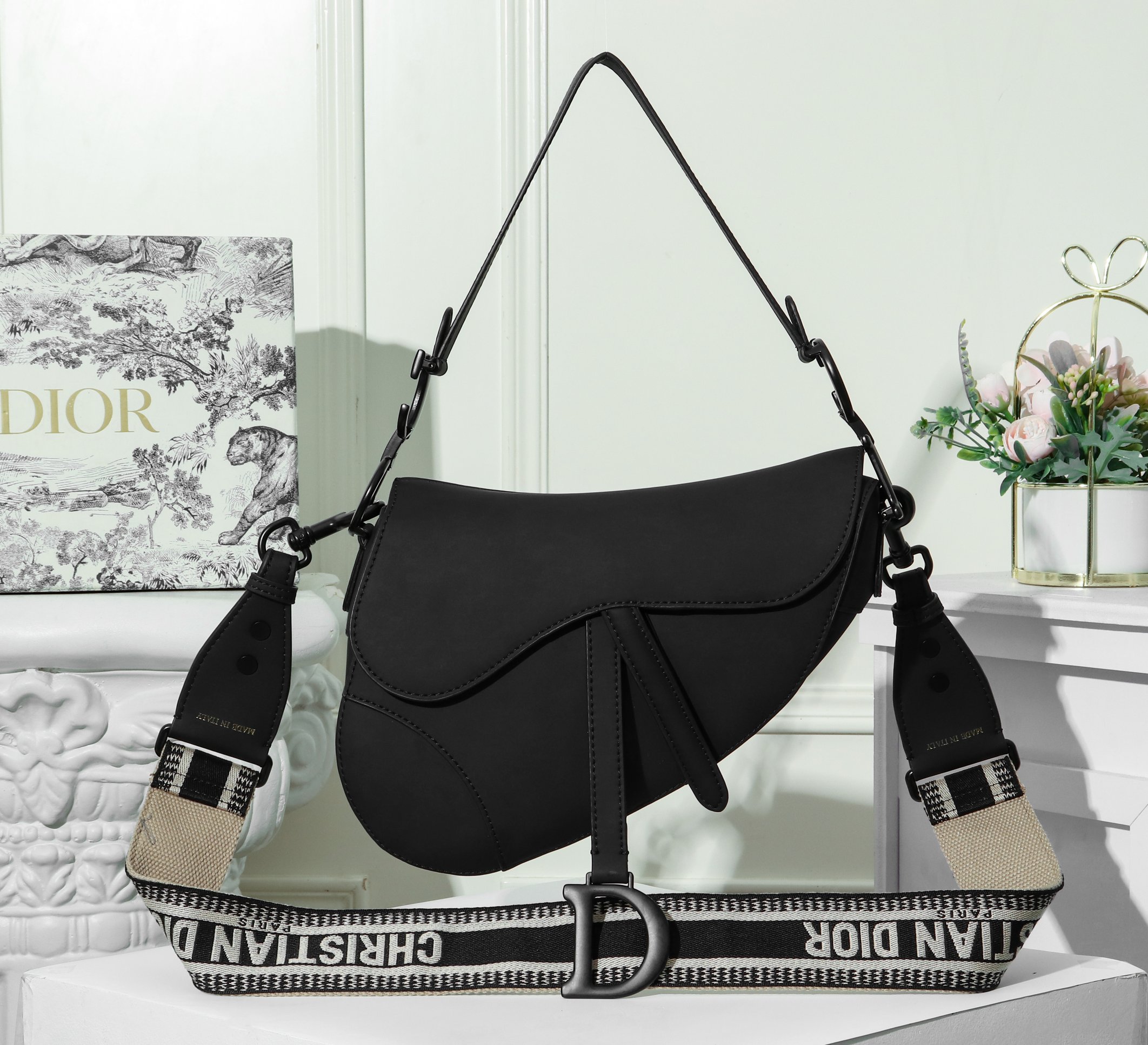 Maria Grazia Chiuri brings a fresh update to the iconic Saddle bag. The heritage design showcases the emblematic 'D'-stirrup magnetic clasp and Saddle flap with the signature 'CD' structure on both sides of the handle. Crafted in black ultramatte calfskin and embellished with tonal metal hardware, the modern style may be customized with alternative straps.