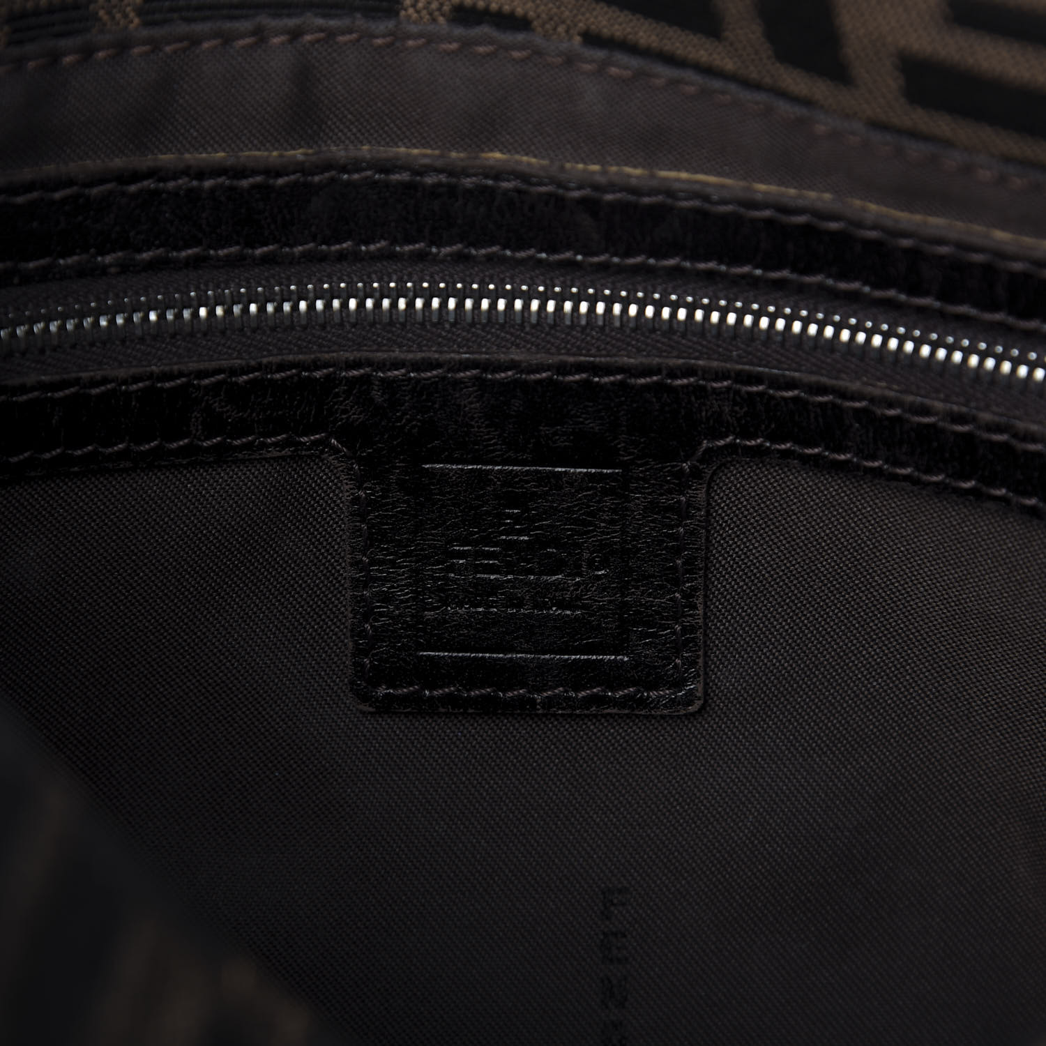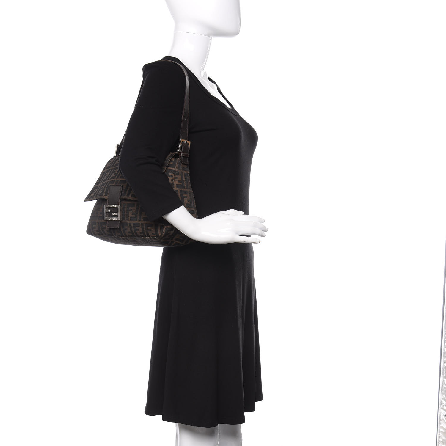 This stylish shoulder bag is finely crafted of Fendi Zucca canvas in tobacco brown. The bag features an adjustable chocolate brown leather shoulder strap and a facing flap with a polished silver Fendi FF logo. The flap opens to a brown fabric interior with a zipper pocket..jpg)