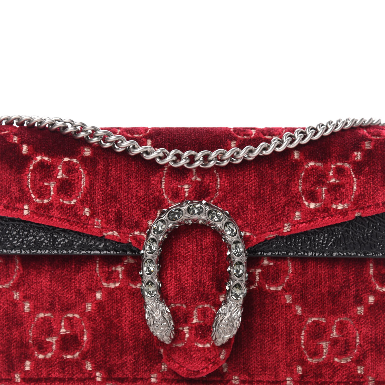This petite bag is crafted of monogrammed velvet in red, with textured black patent leather trim. This shoulder bag features an optional matte silver chain shoulder strap and a textured horseshoe tiger spur closure encrusted with crystals. The flap opens to a beige suede interior with a removable key ring.