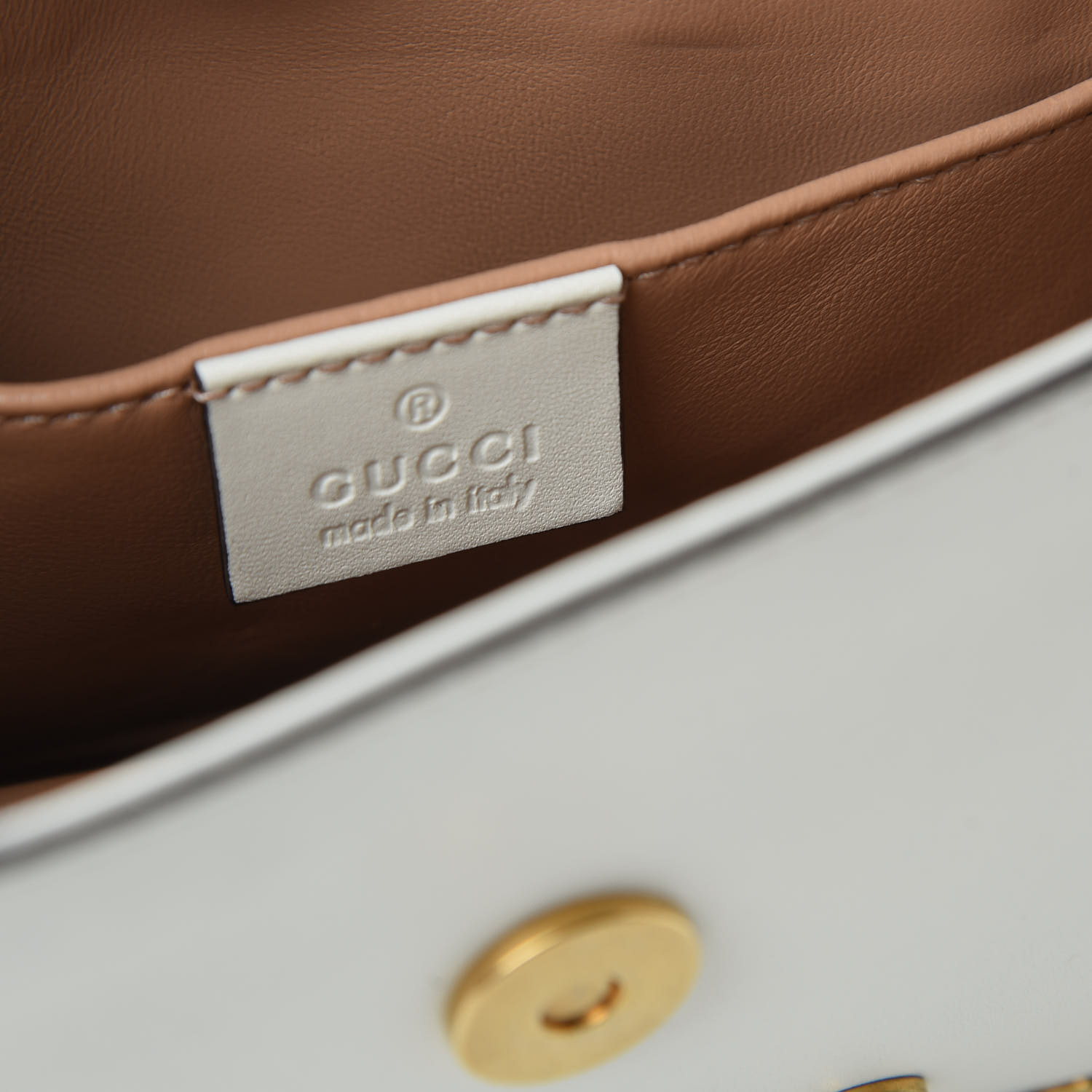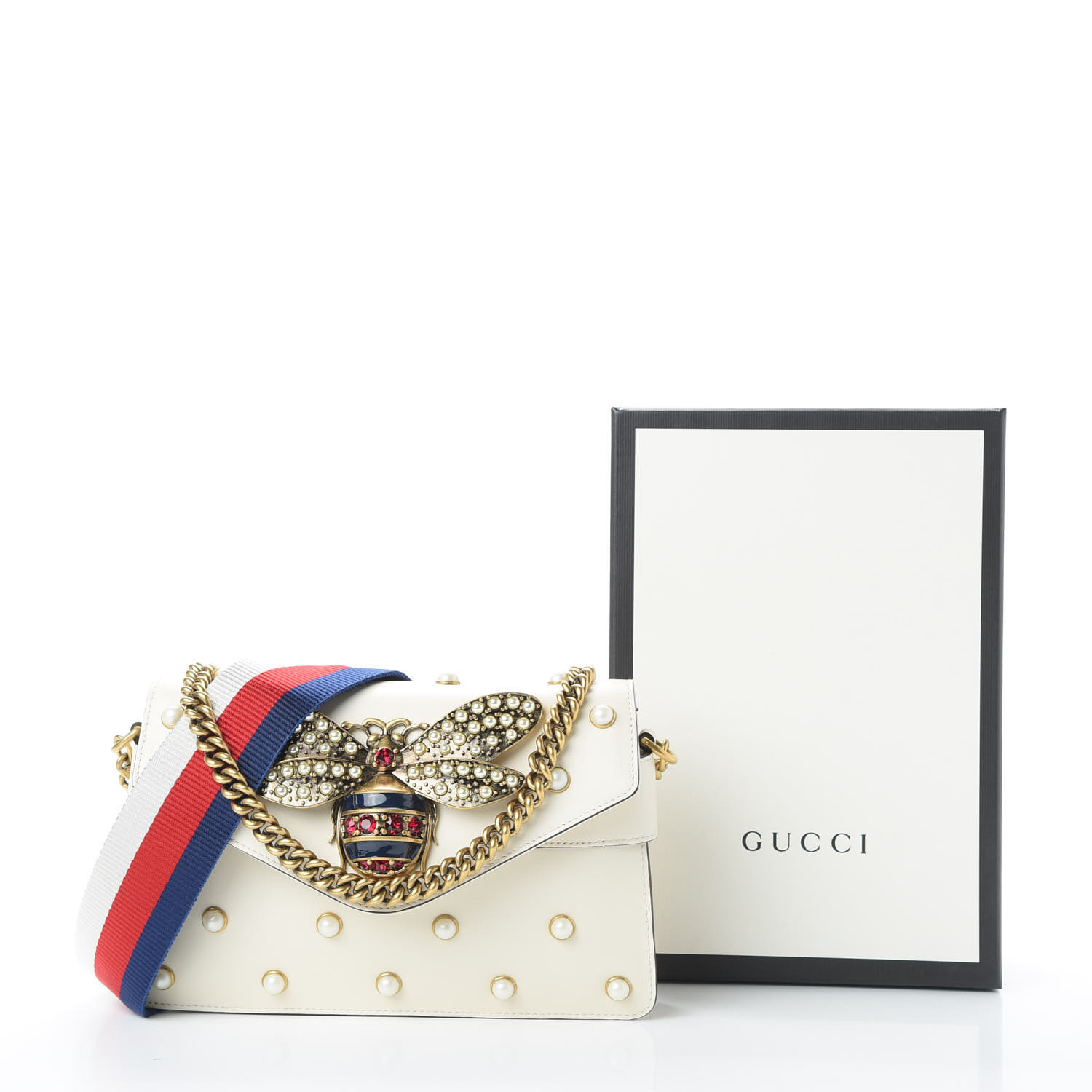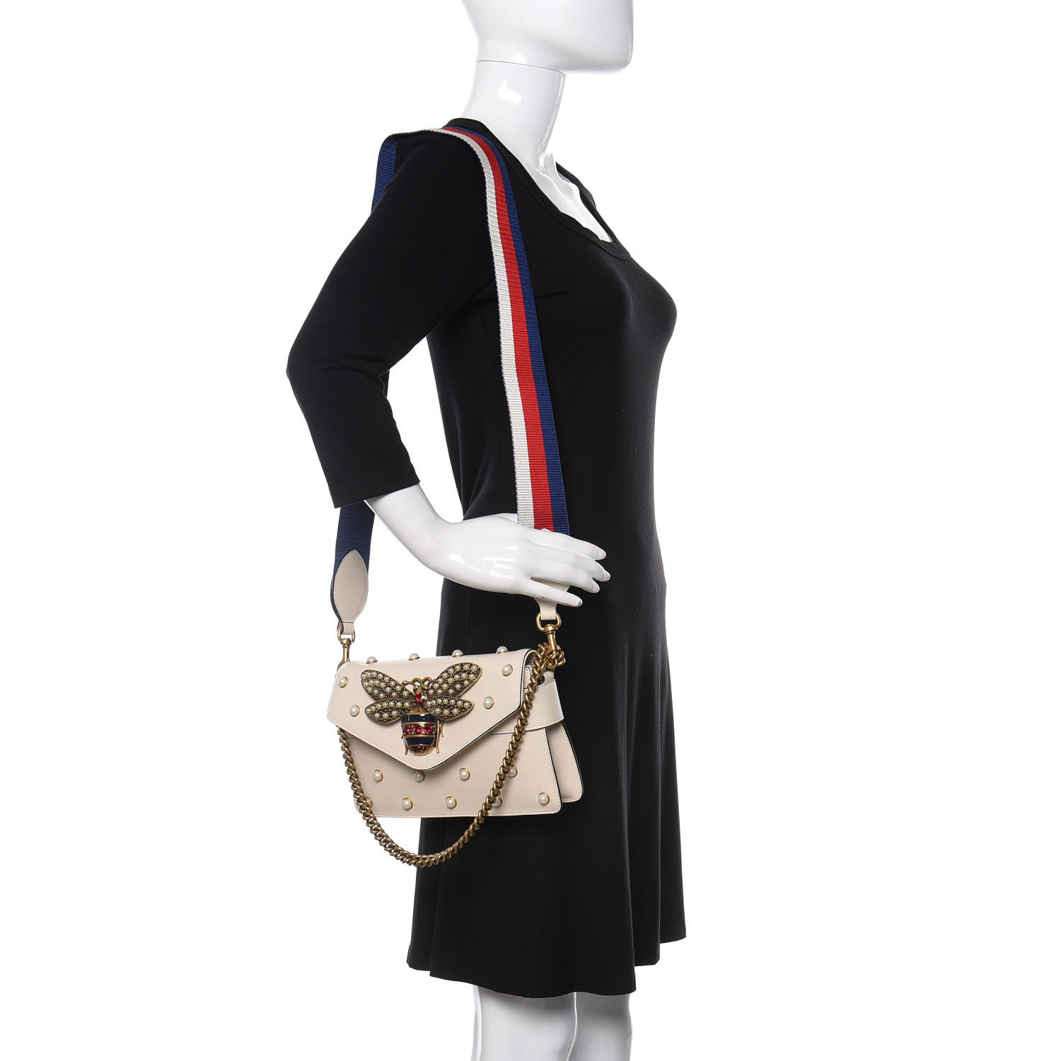 This stylish shoulder bag is crafted of calfskin leather in off white. The bag features a gold chain shoulder strap, an optional red, white and blue web shoulder strap, and faux pearl detailing with a gold bee motif on the flap. The flap opens to a beige leather interior with a flat pocket. This is an on-trend mini bag that is versatile and stylish, by Gucci!.jpg)