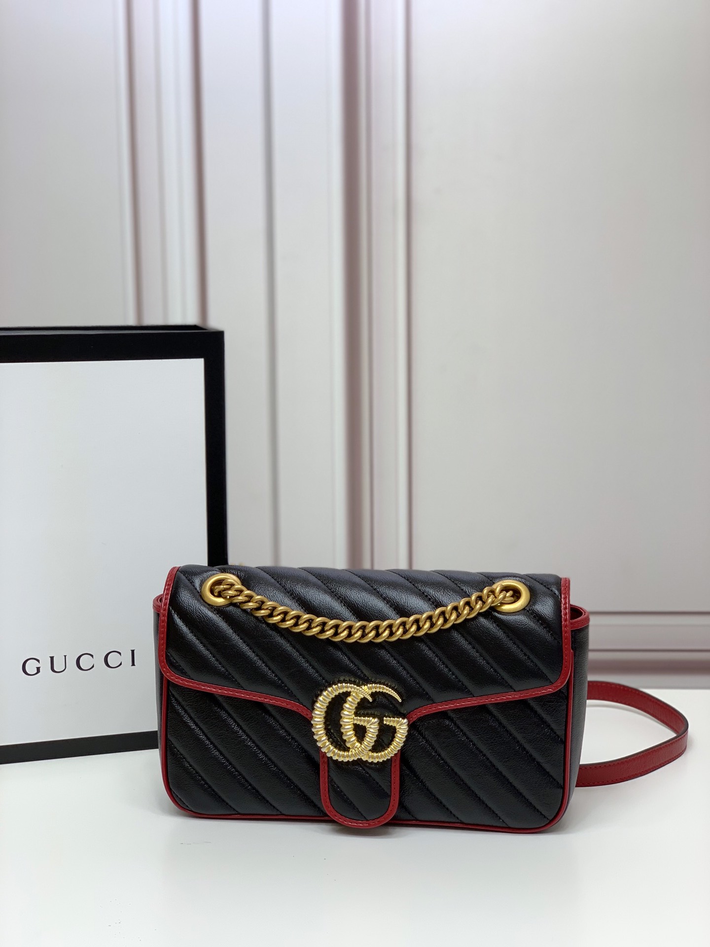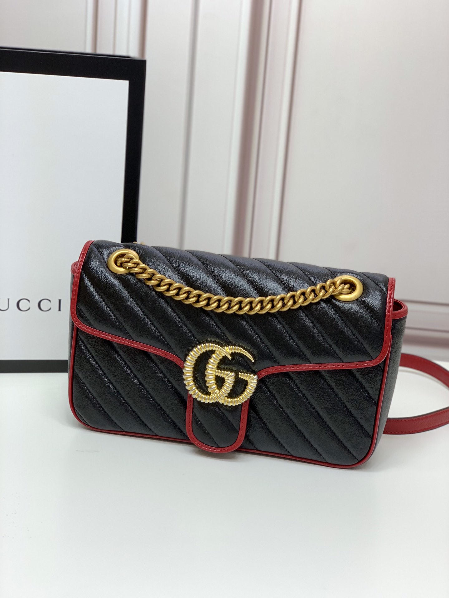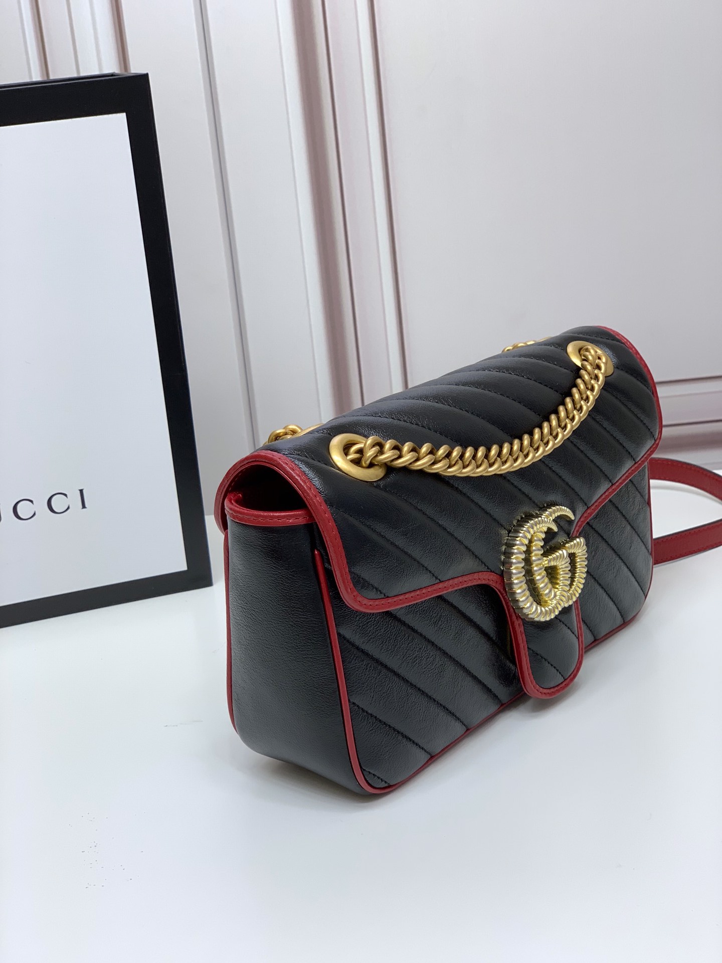 This handbag is crafted of soft calfskin leather in black. This bag features red leather trim, an antique gold chain shoulder strap with red leather shoulder pad and an interlocking antique GG logo closure. The front flap opens to a beige fabric interior with a zipper pocket. This is a fashionable everyday shoulder bag, from Gucci!