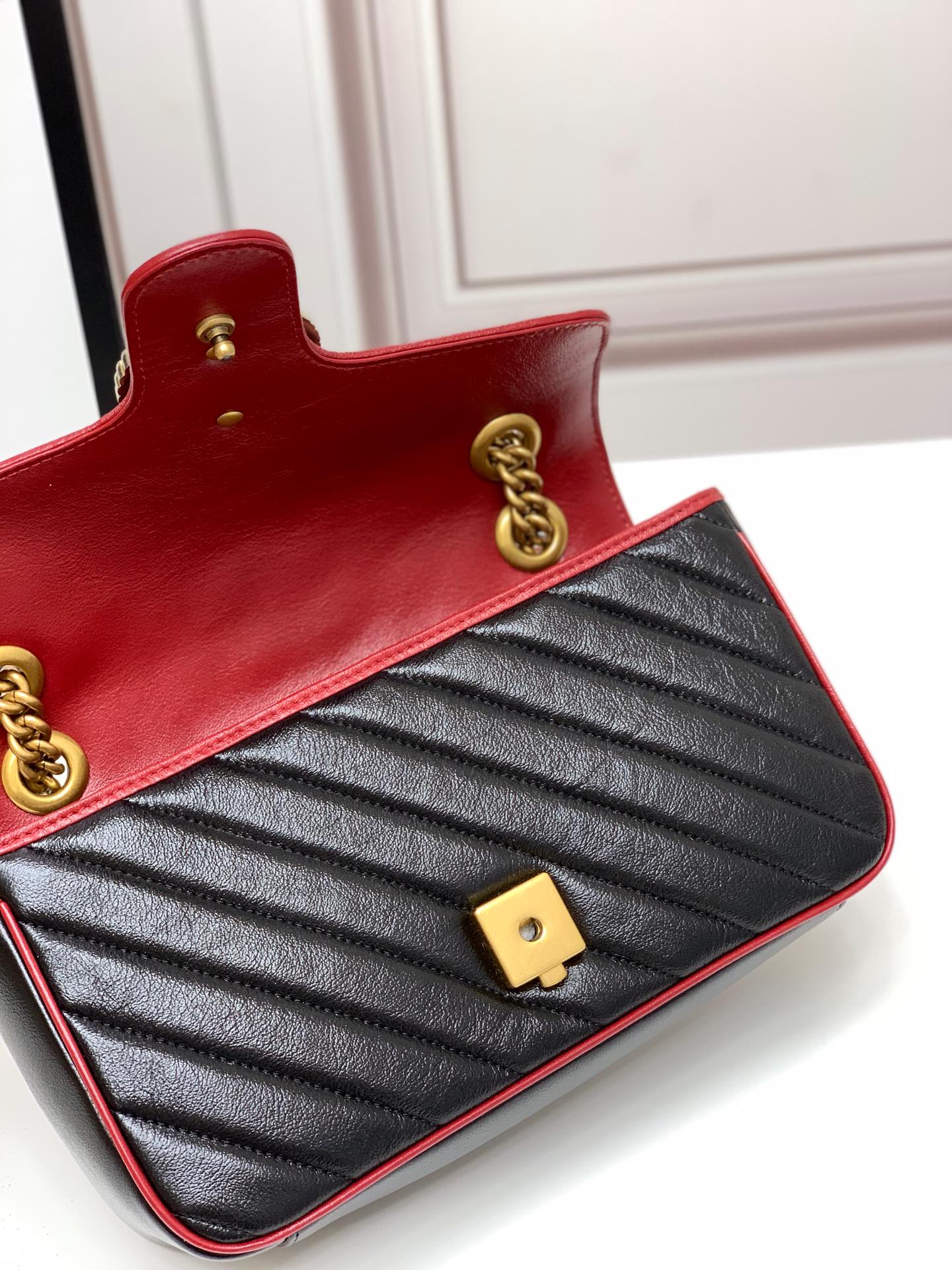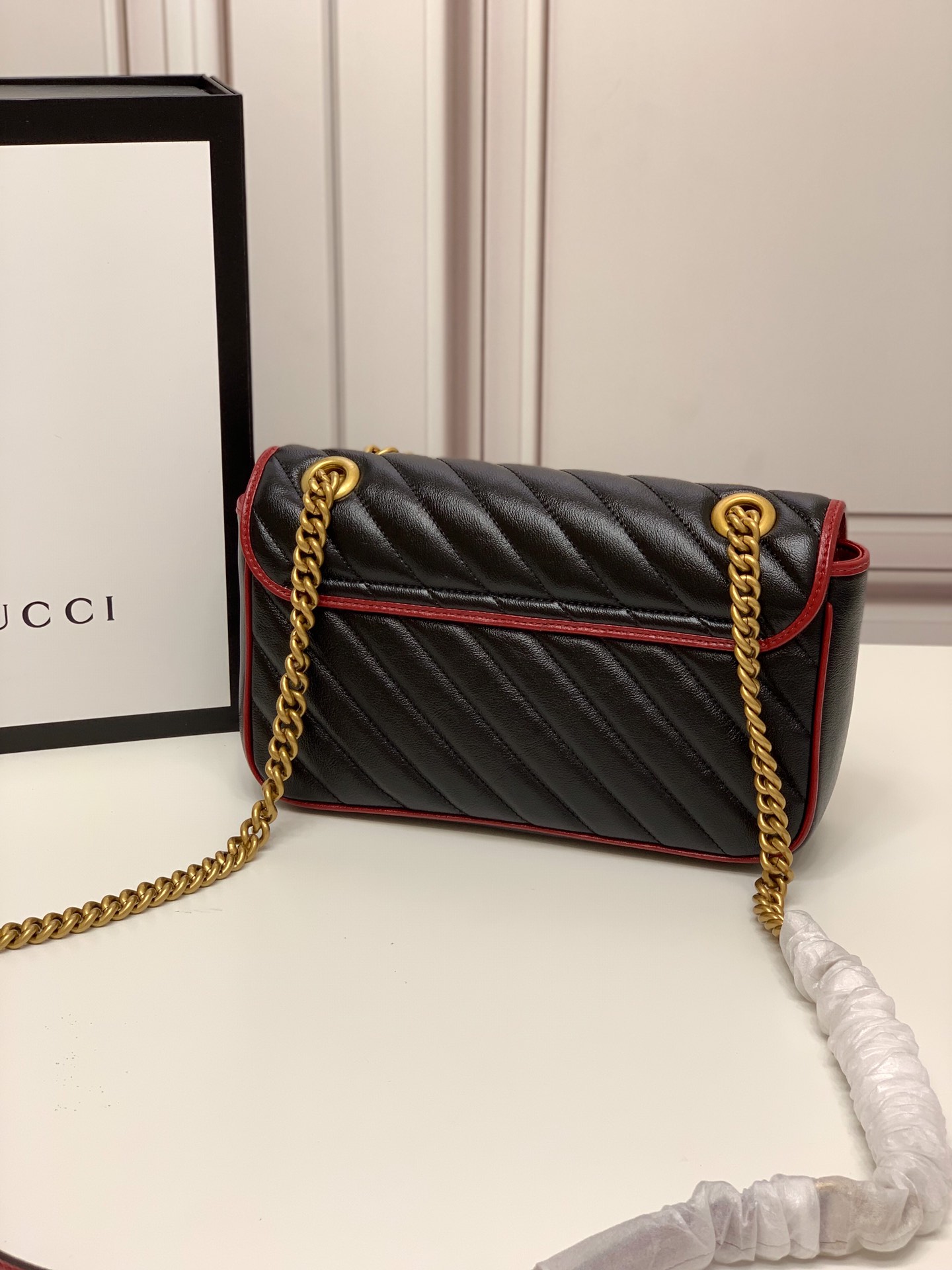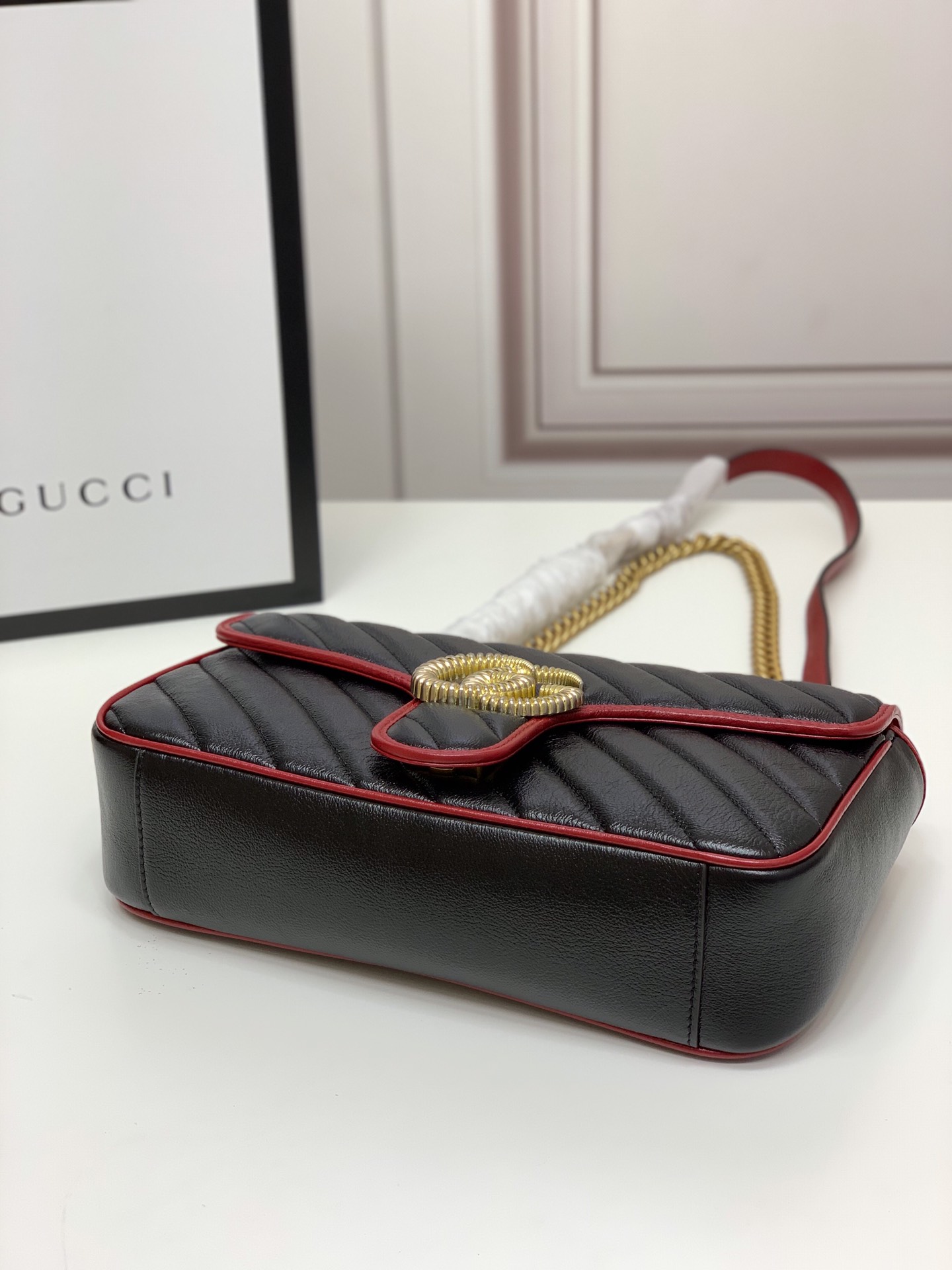 This handbag is crafted of soft calfskin leather in black. This bag features red leather trim, an antique gold chain shoulder strap with red leather shoulder pad and an interlocking antique GG logo closure. The front flap opens to a beige fabric interior with a zipper pocket. This is a fashionable everyday shoulder bag, from Gucci!