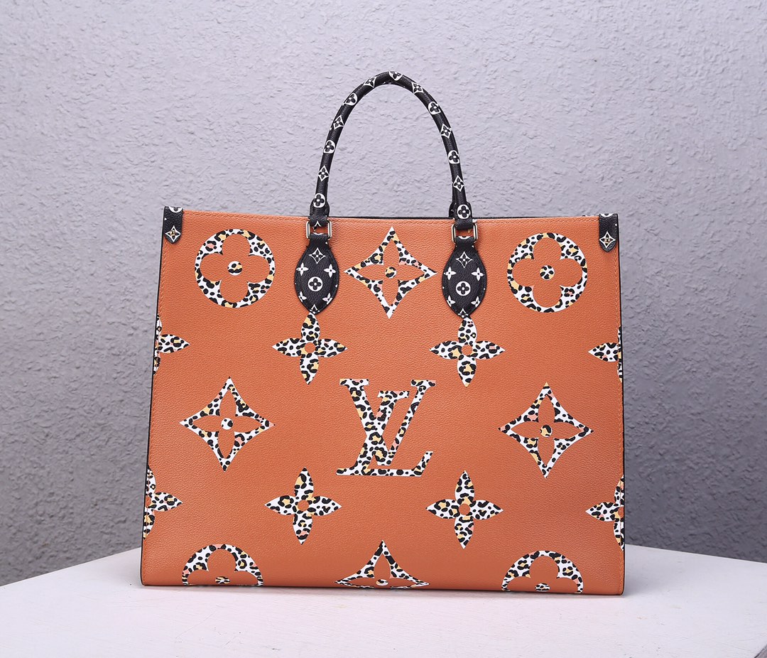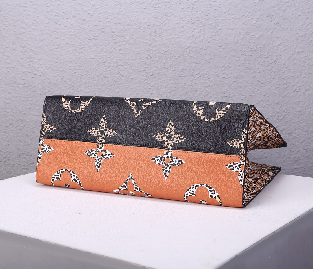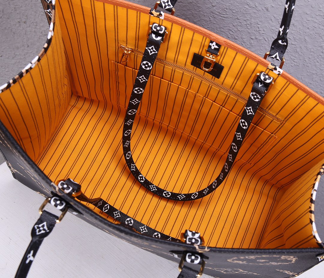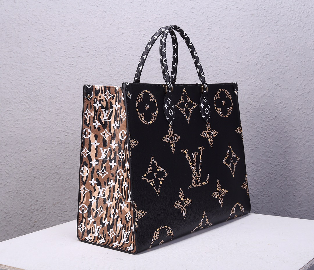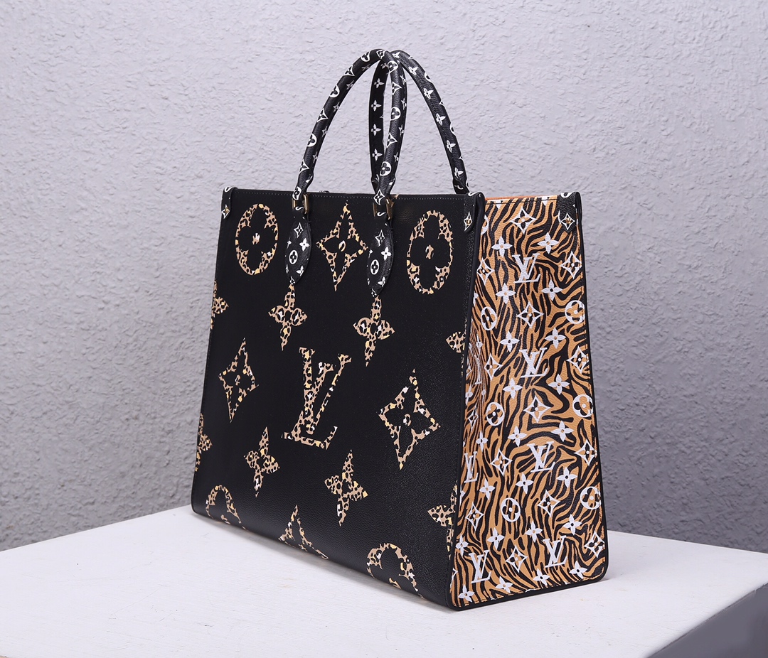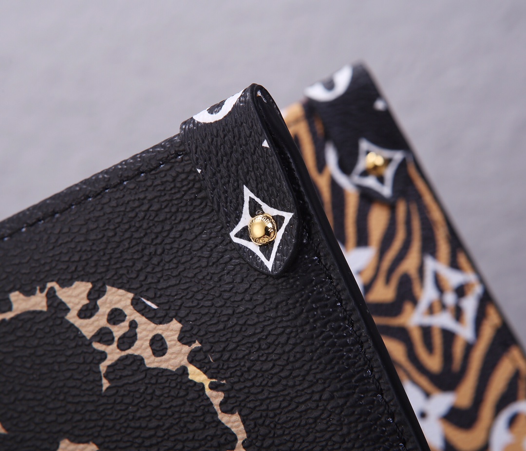 This limited edition tote features oversized and smaller sized versions of the classic Louis Vuitton monogram in coated canvas jungle black with animal print side panels. The bag features monogrammed printed top handles and long strap handles. The top opens to a spacious striped textile interior with zipper and patch pockets. This is a gorgeous tote with an exceptional look for a day of play, from Louis Vuitton!