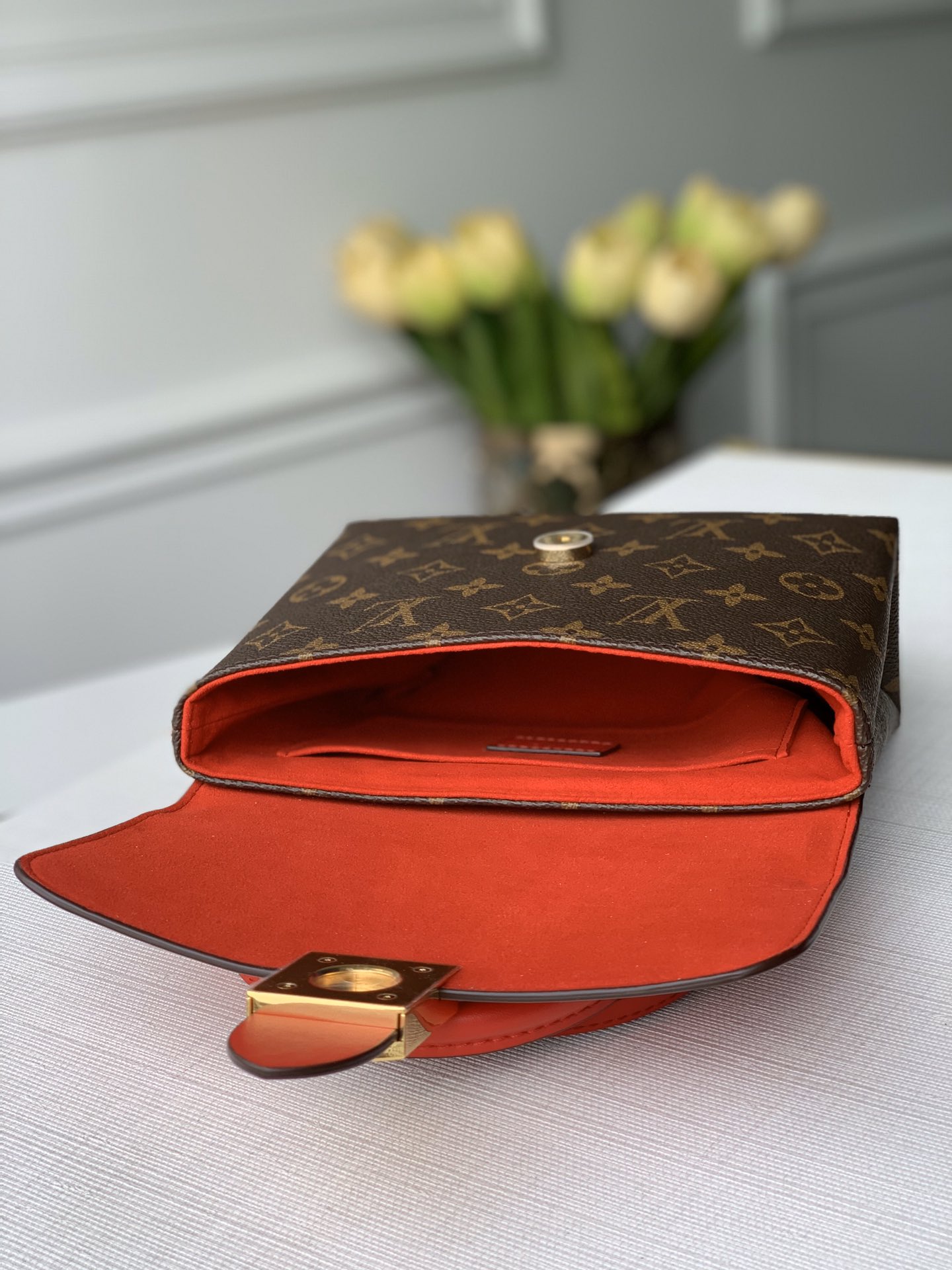 This versatile handbag features Louis Vuitton's signature monogram with a red leather flap top. The handbag features a top handle, optional leather shoulder straps, and polished gold hardware. The front flap opens to a microfiber interior with a flat pocket. Indulge in the feminine charms of this luxury masterpiece, from Louis Vuitton!