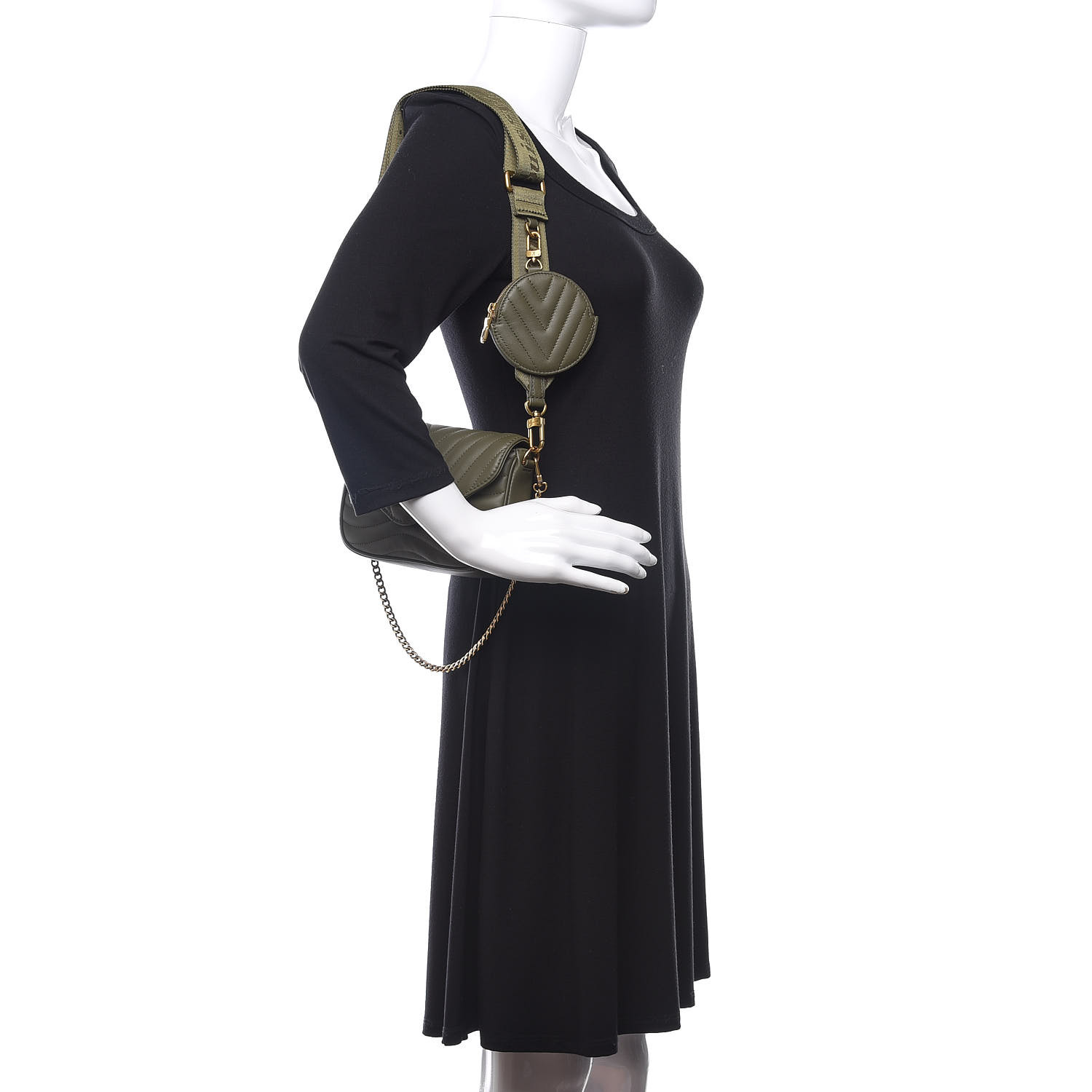 This chic pochette is crafted of quilted calfskin leather in green. The shoulder bag features a gold chain strap, an optional shoulder strap, and edgy hardware with an aged gold metal finish. The top flap opens to a matching microfiber interior with a patch pocket. Enjoy this bag for day or evening use with the luxury and style of Louis Vuitton!
