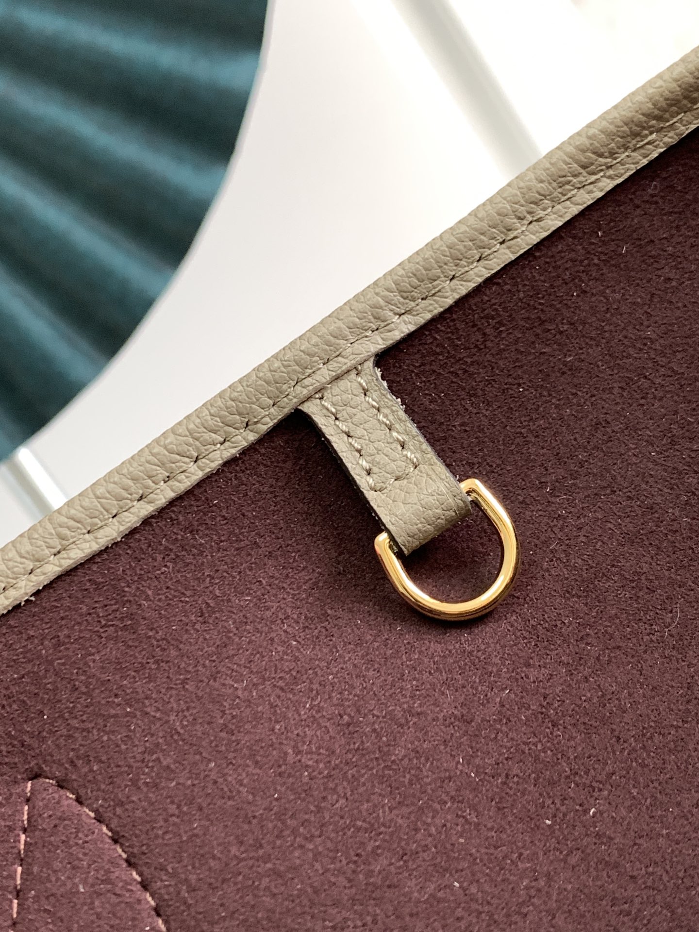This spacious tote is crafted of turtledove gray monogram embossed calf leather. The bag features leather top handles and polished gold tone hardware with side cinches. The top is open to a spacious dark red microfiber interior with a hanging zipper pocket.