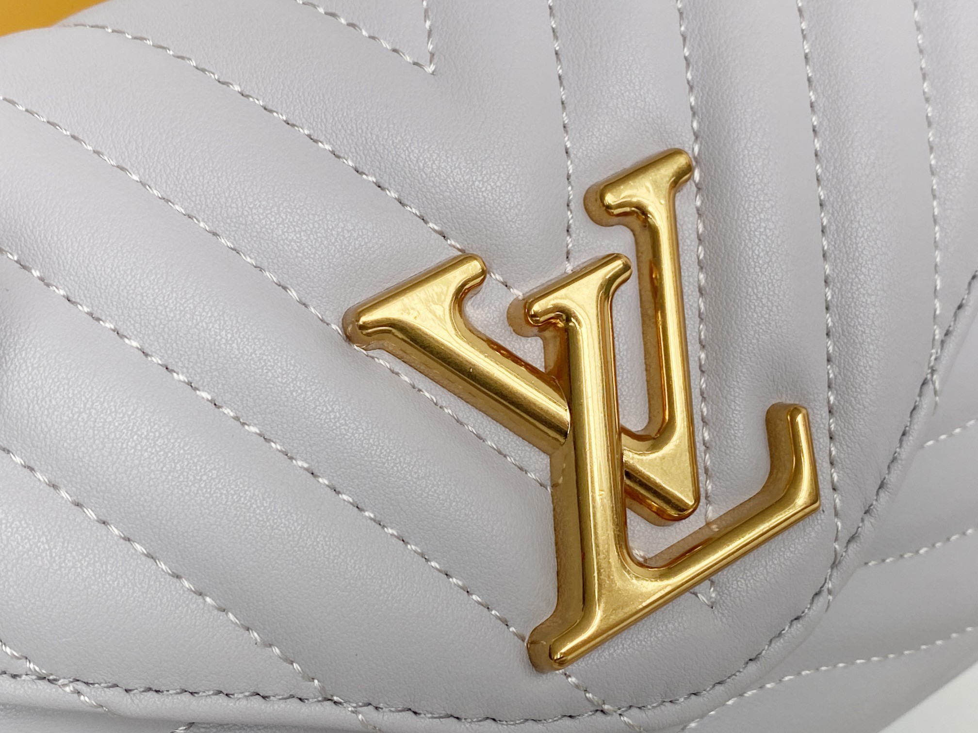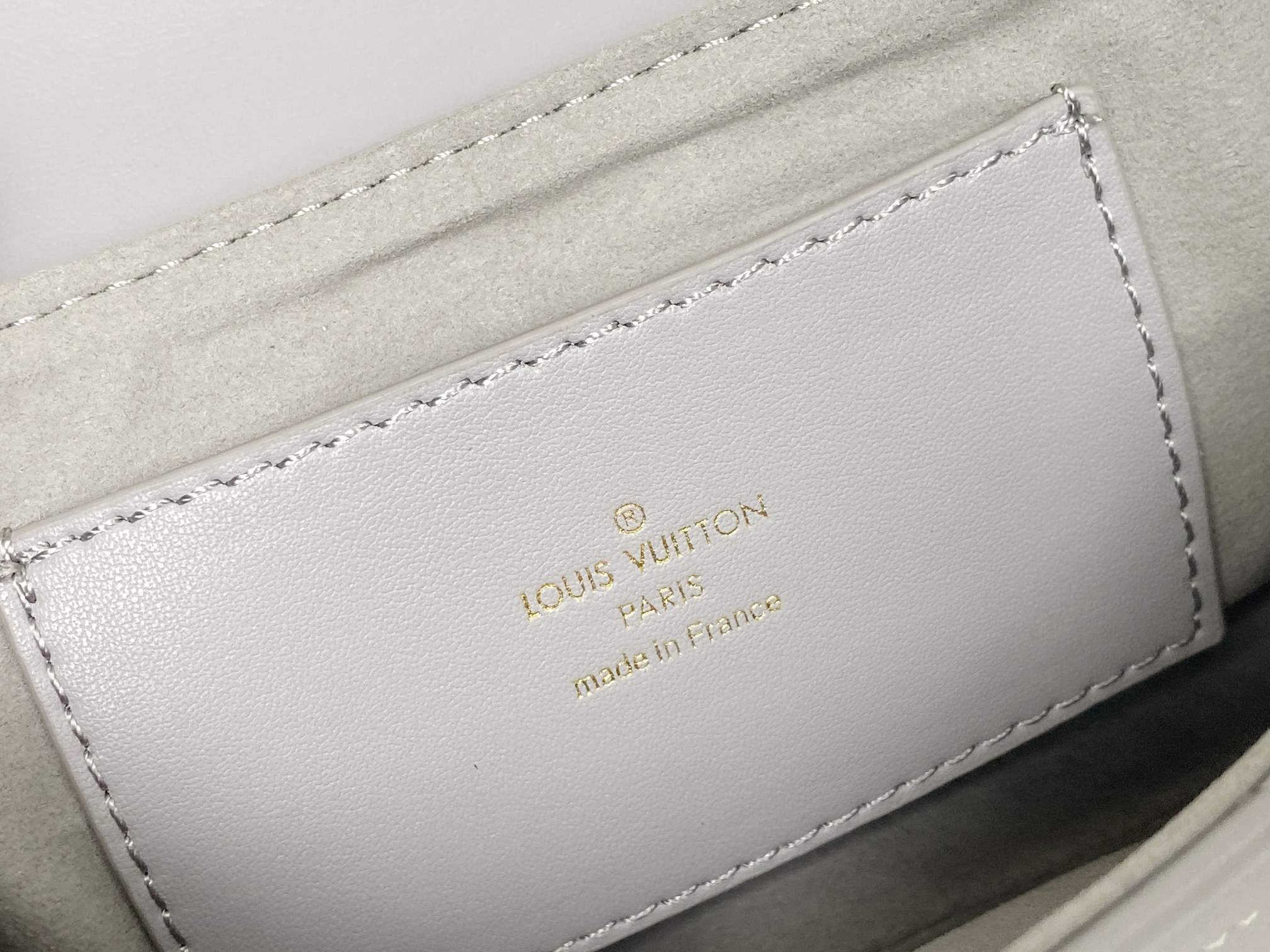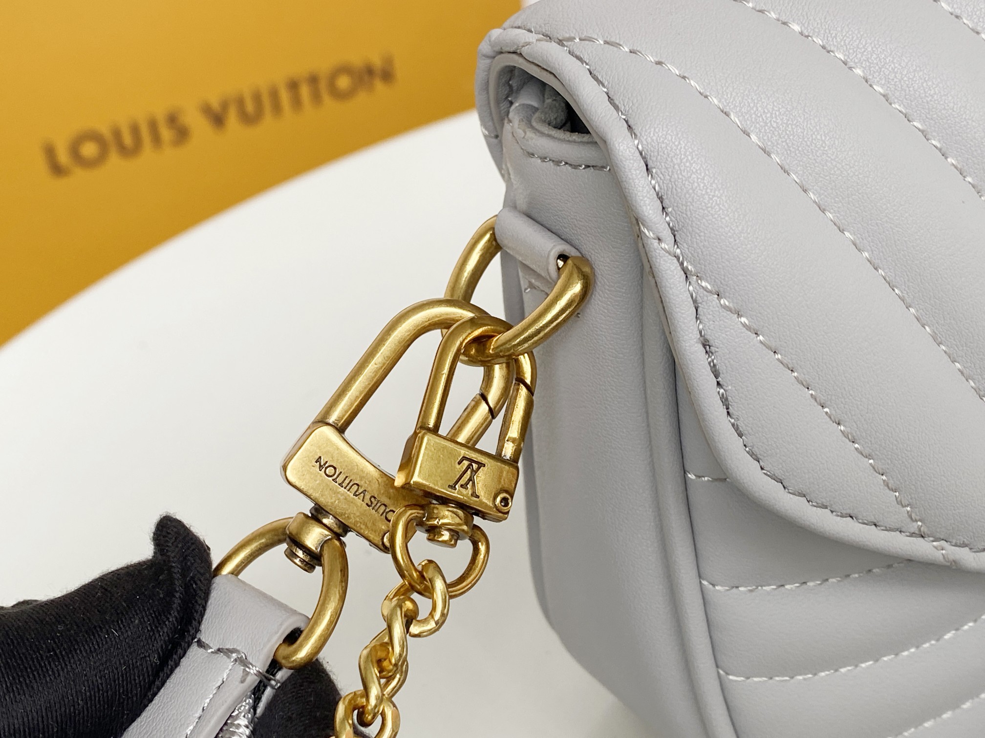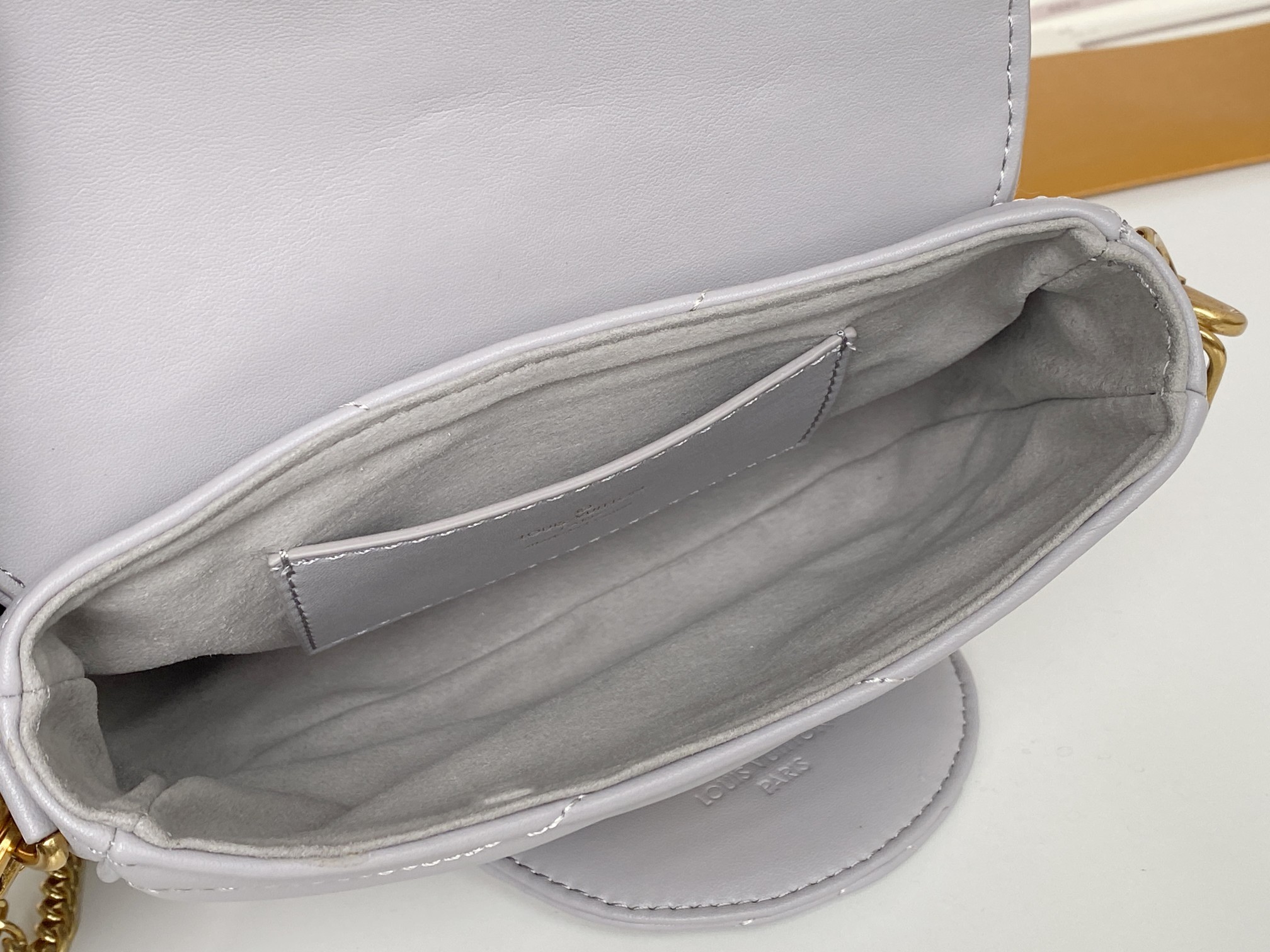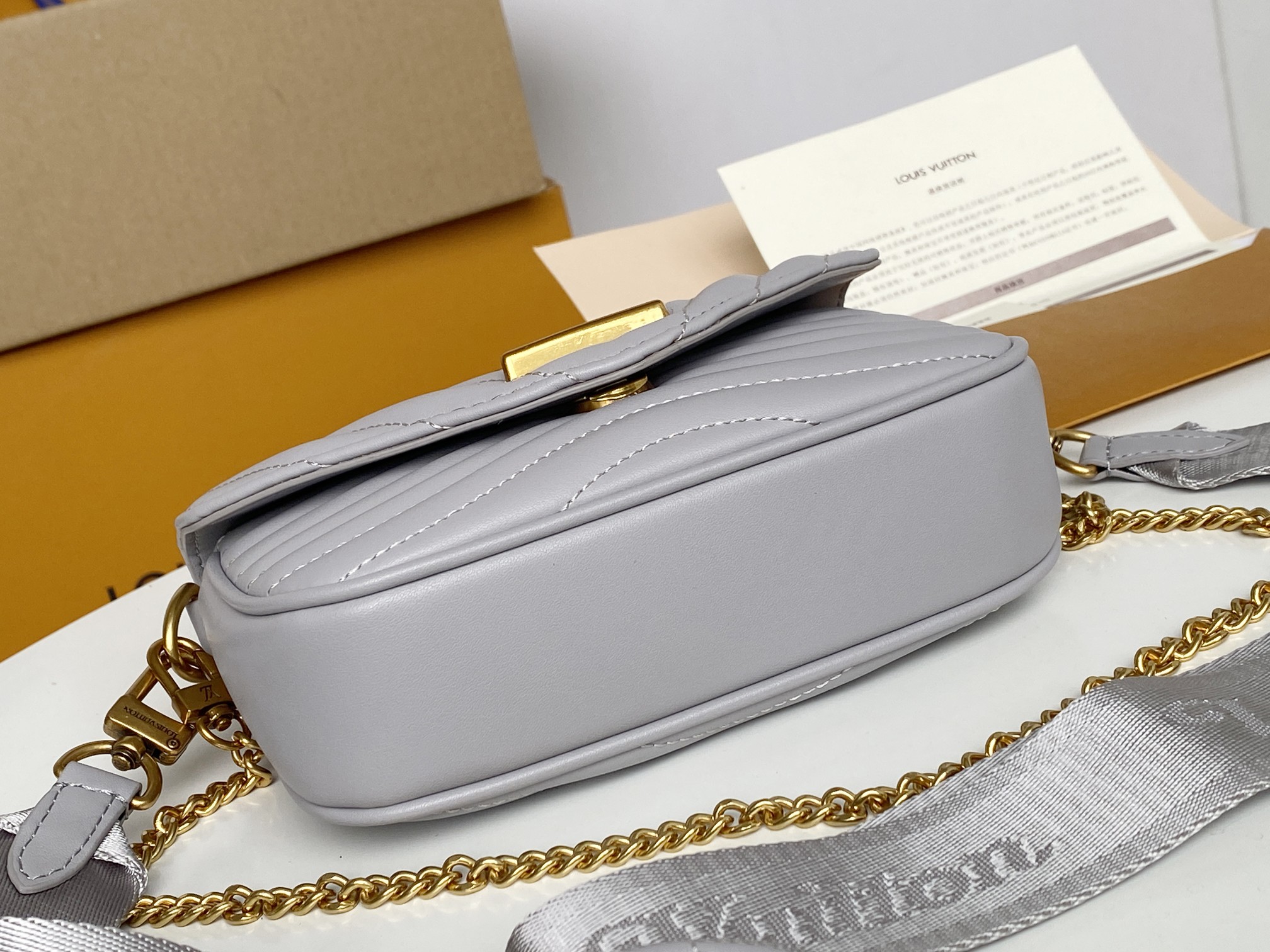 This chic shoulder bag is crafted of quilted calfskin leather in light grey. The shoulder bag features a gold chain strap, an adjustable shoulder strap, and edgy hardware with an aged gold metal finish. The top flap opens to a light grey microfiber interior with a patch pocket. Enjoy this bag for day or evening use with the luxury and style of Louis Vuitton!