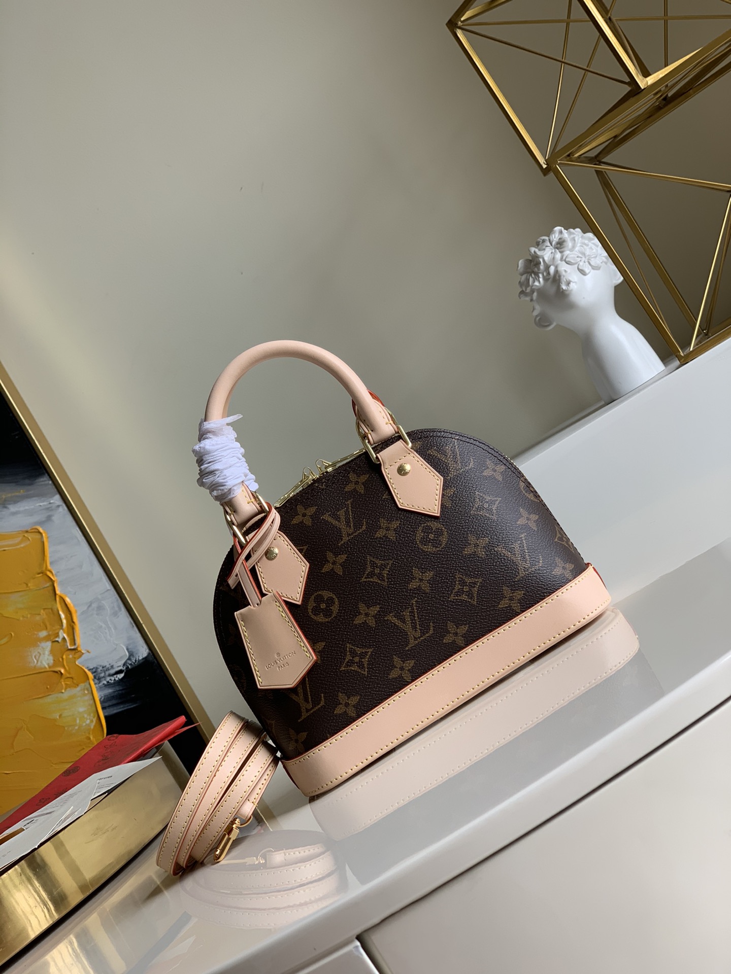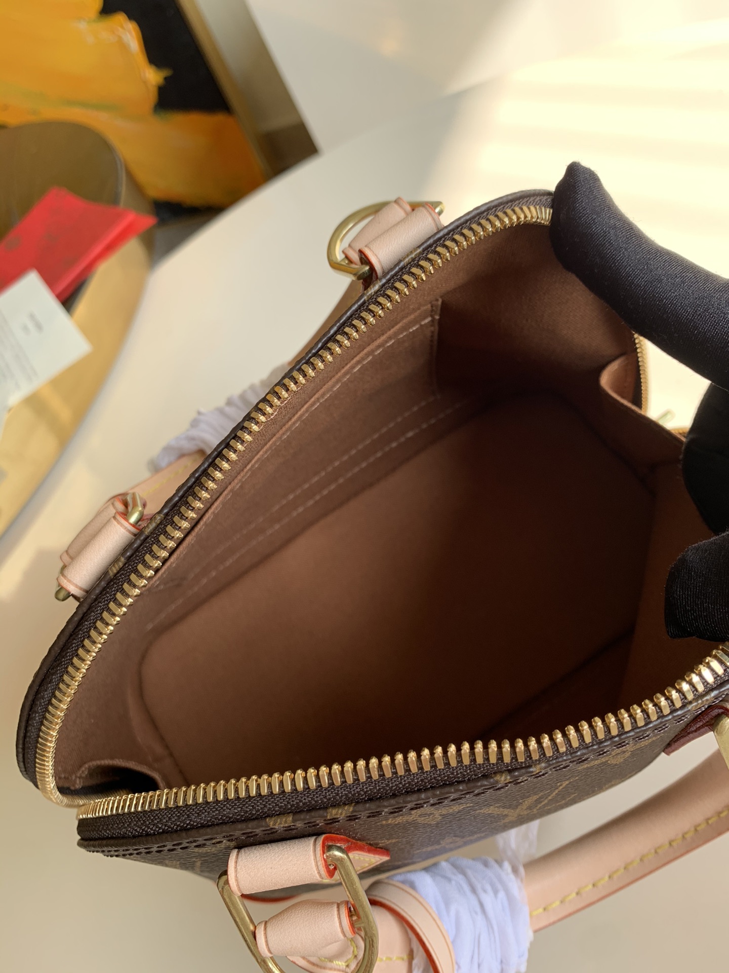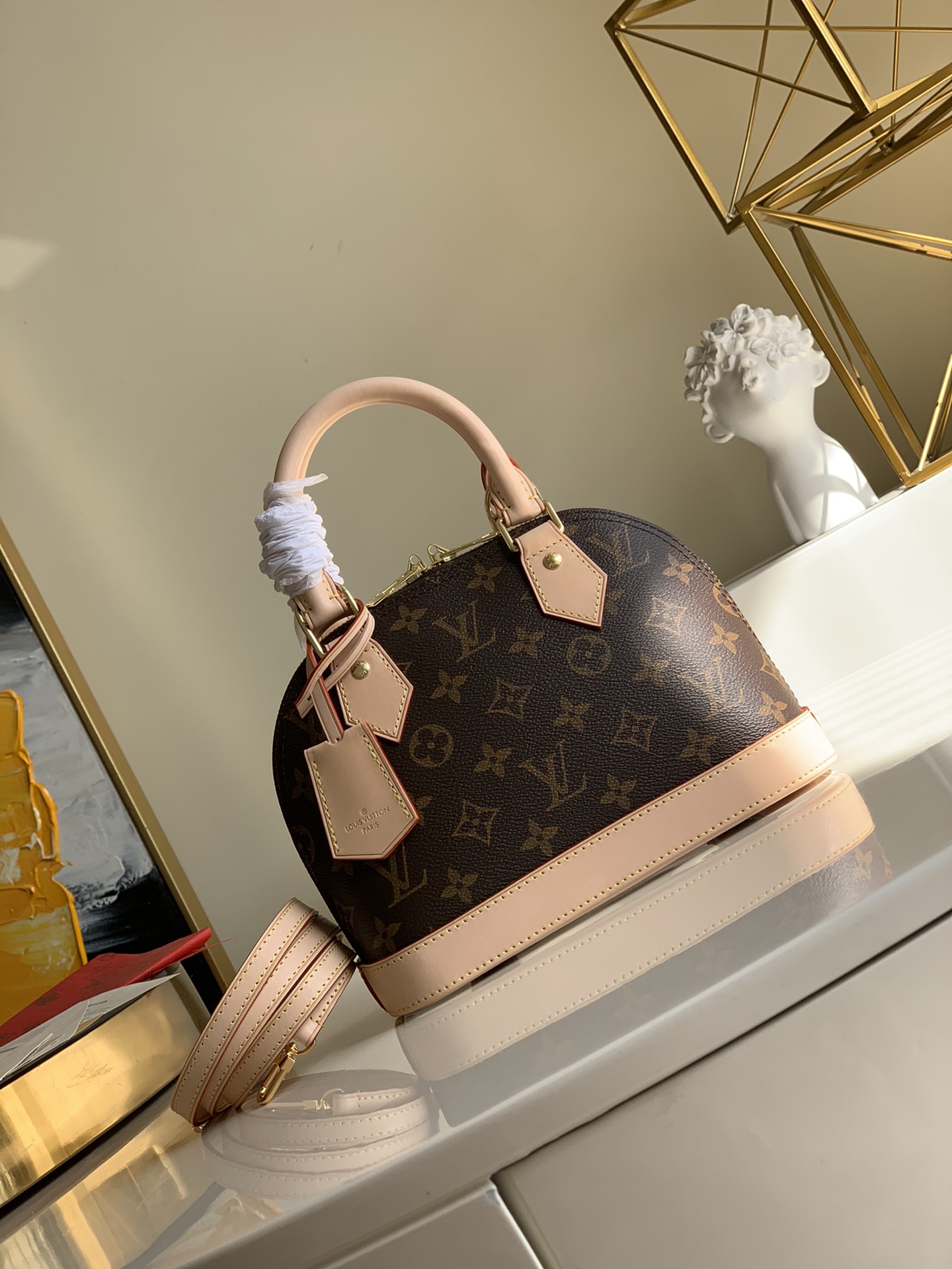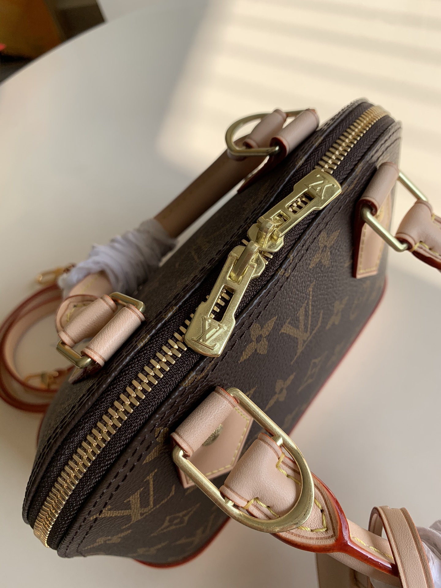 This small tote is crafted of classic Louis Vuitton monogram coated canvas. The bag features vachetta cowhide leather trim including a solid base, rolled leather top handles, an optional shoulder strap with polished brass hardware, and a removable key clochette. The wrap-around zippers open to a cocoa brown fabric interior with a patch pocket.