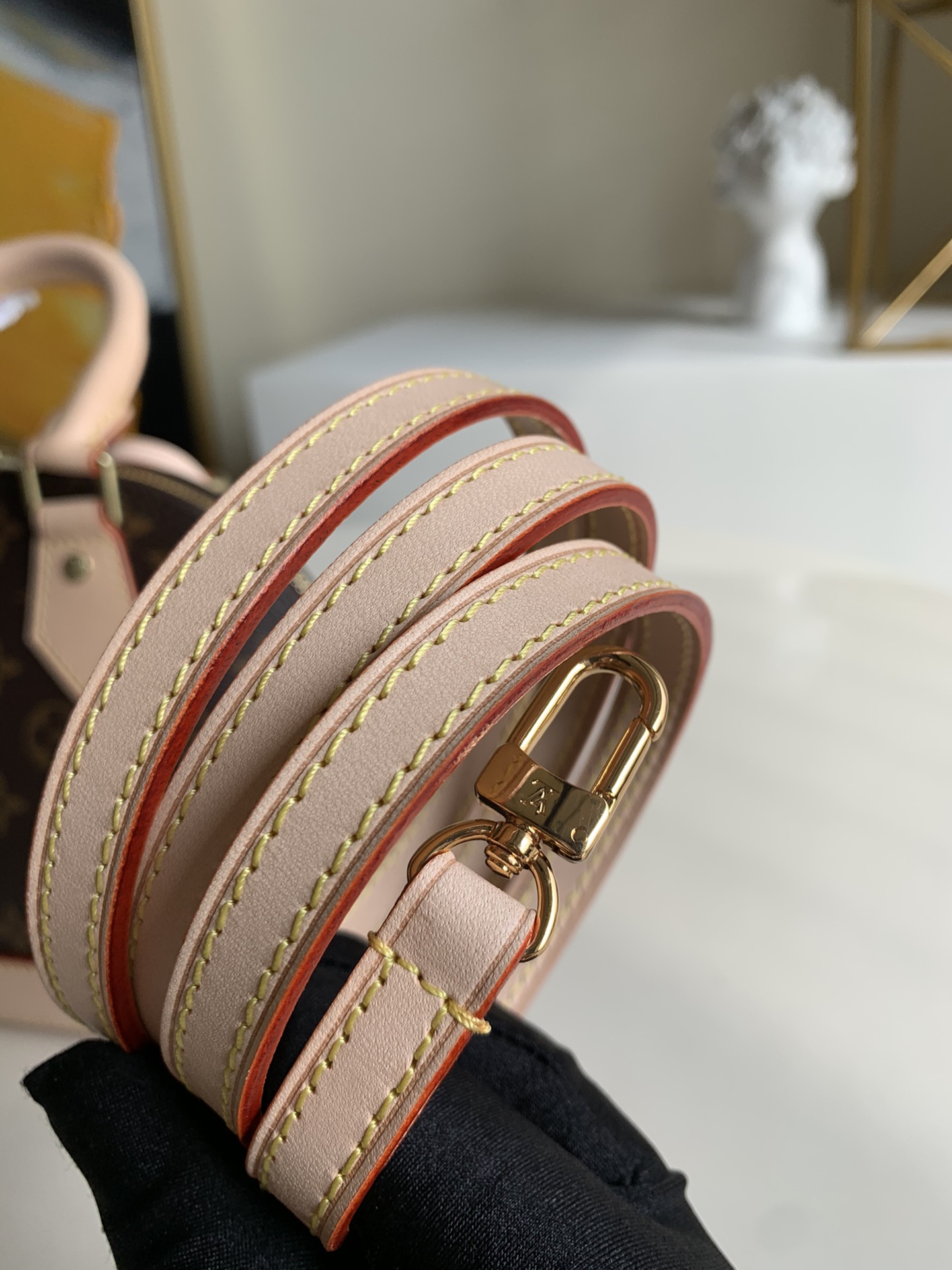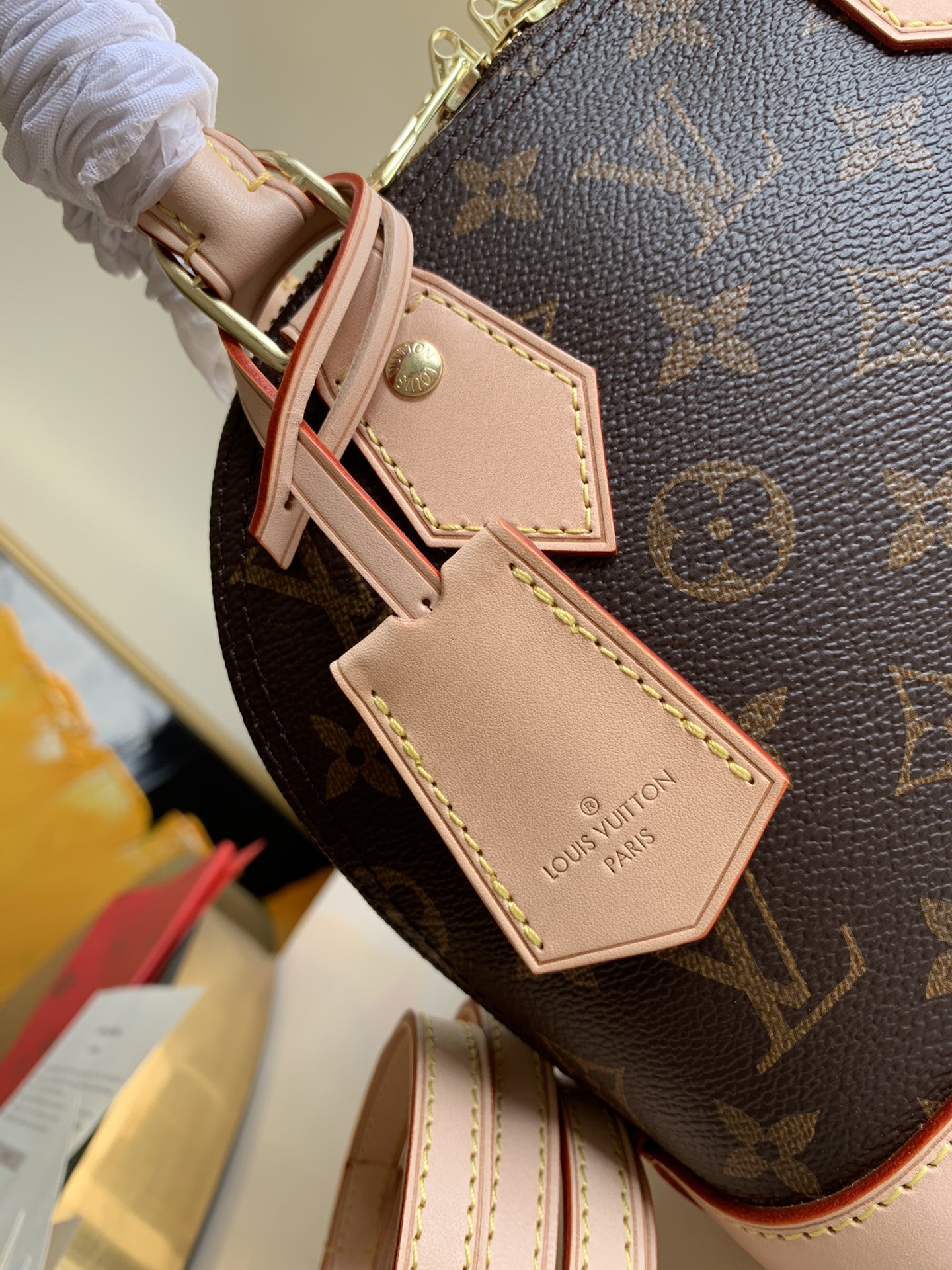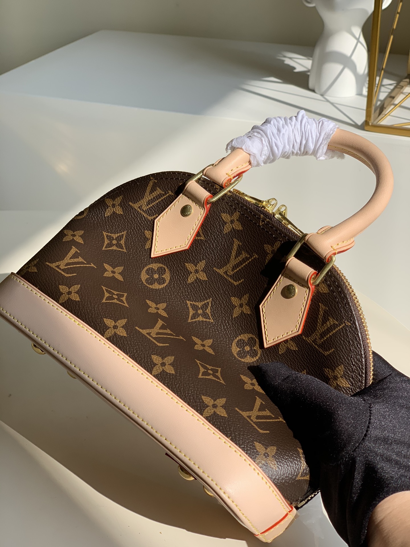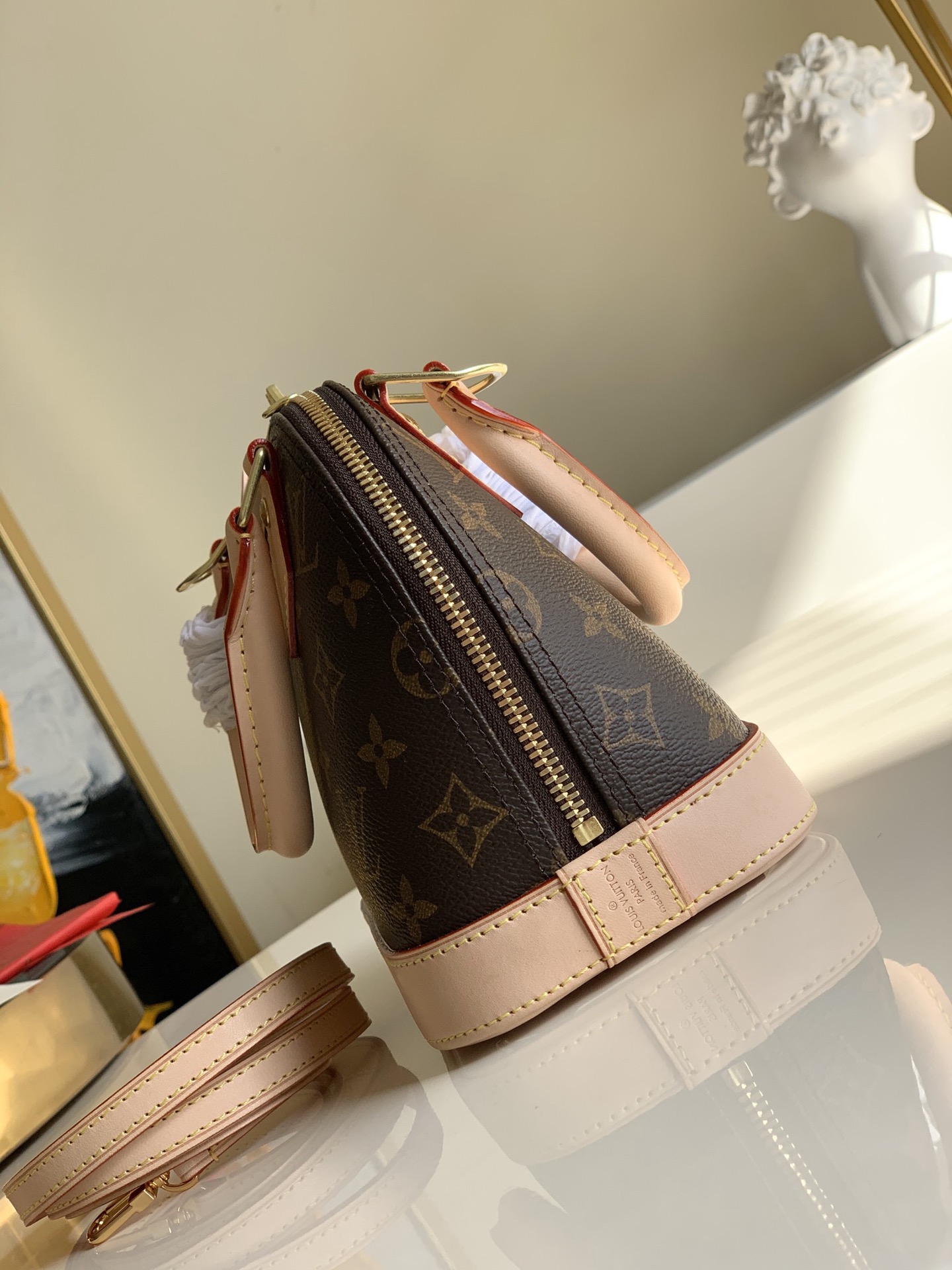 This small tote is crafted of classic Louis Vuitton monogram coated canvas. The bag features vachetta cowhide leather trim including a solid base, rolled leather top handles, an optional shoulder strap with polished brass hardware, and a removable key clochette. The wrap-around zippers open to a cocoa brown fabric interior with a patch pocket.