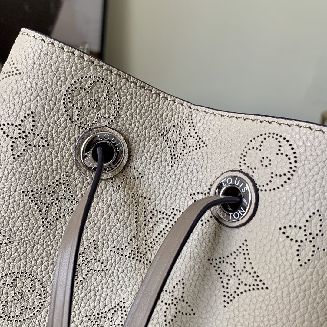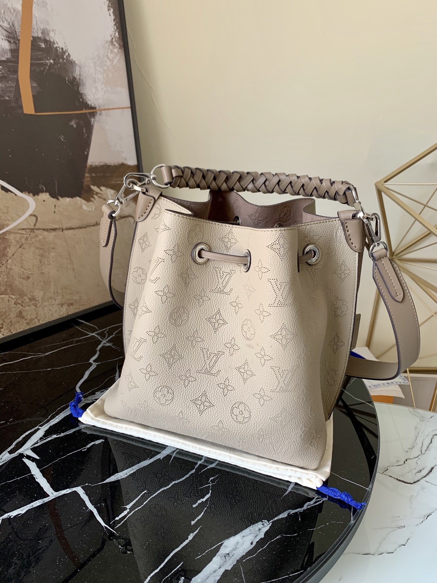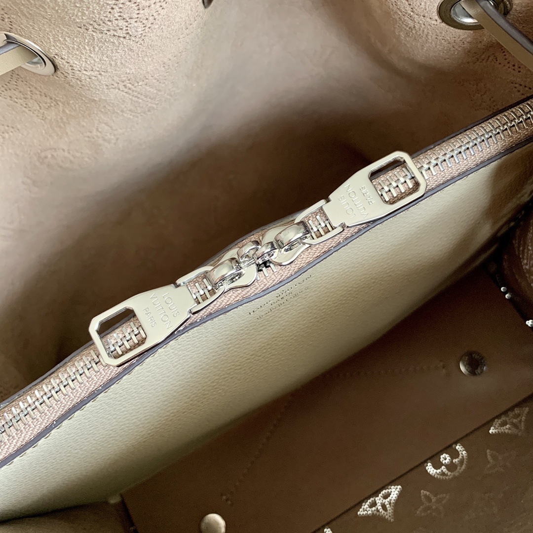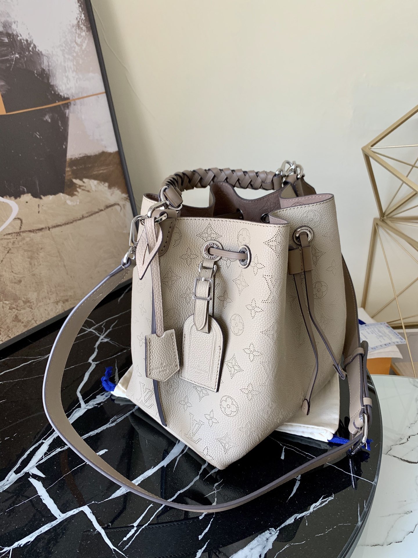 This chic shoulder bag is crafted of fine perforated mahina leather in soft beige. The shoulder bag features a pull cinch cord, optional shoulder strap, rolled top handles and polished silver hardware. The top opens to a spacious microfiber interior with a matching removable pouch perfect for all of your everyday necessities with the luxury and style only from Louis Vuitton!