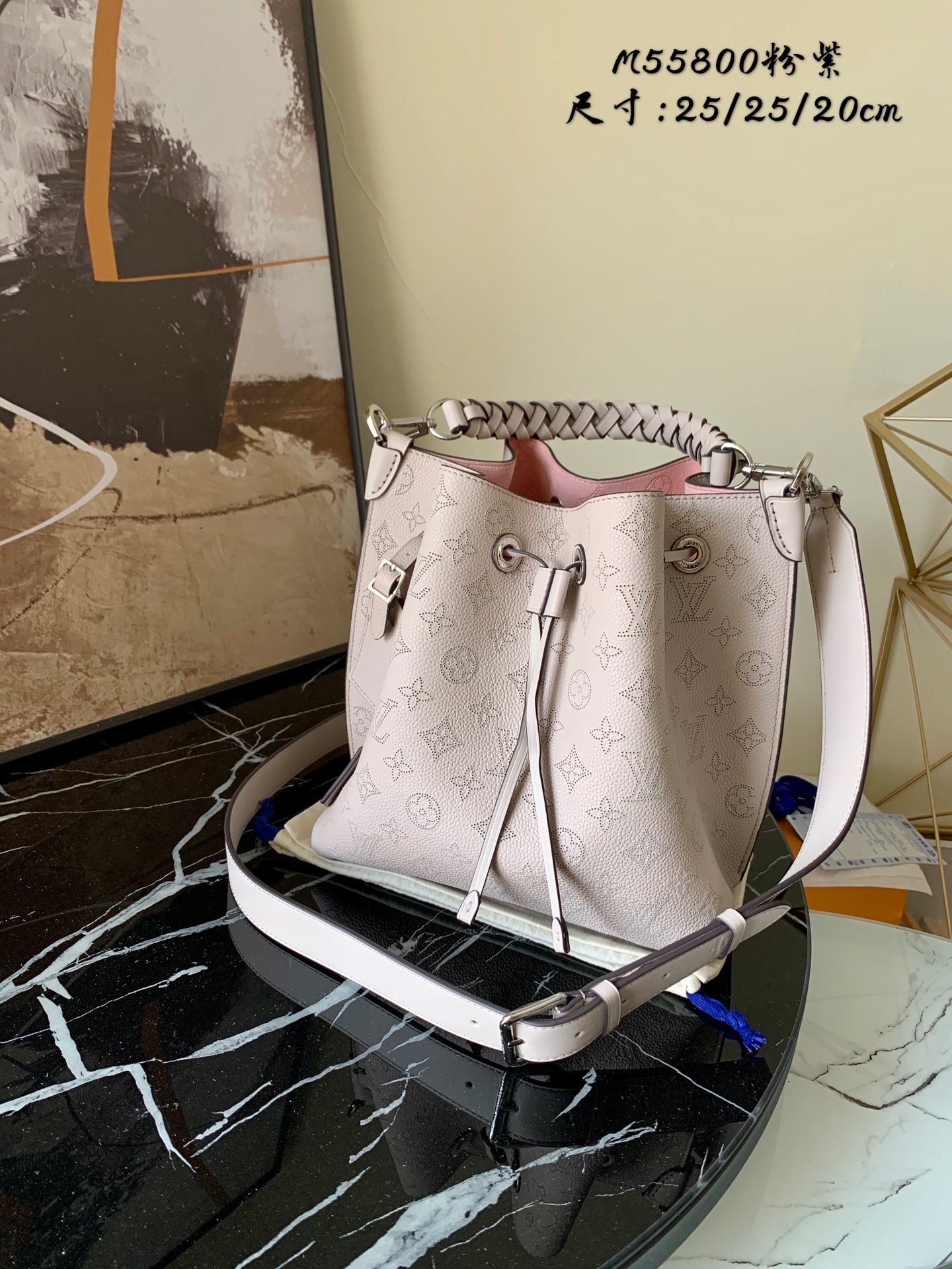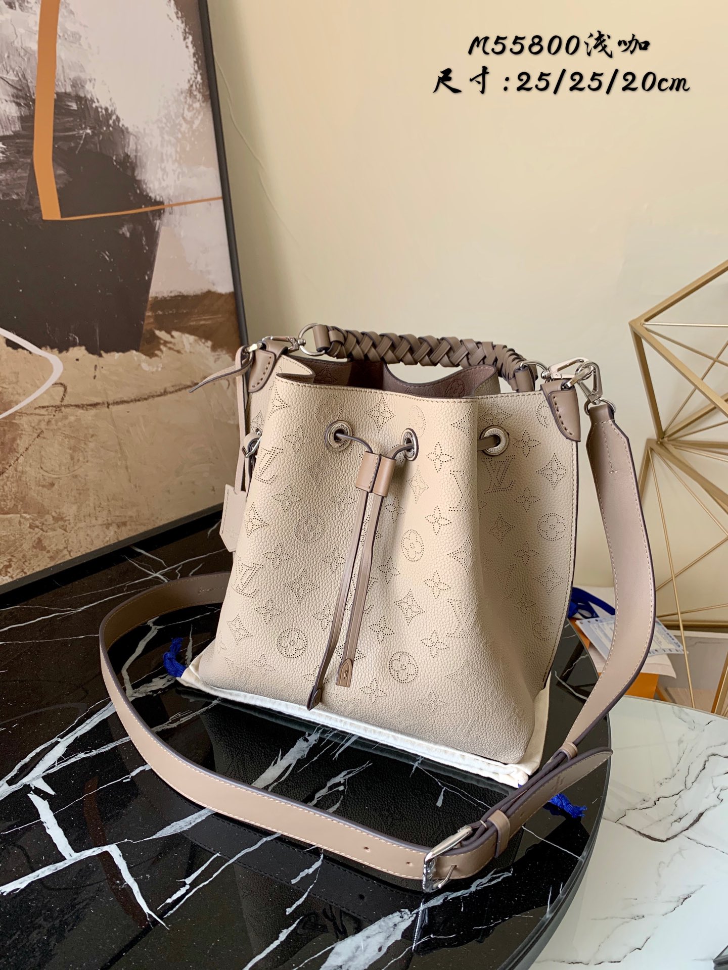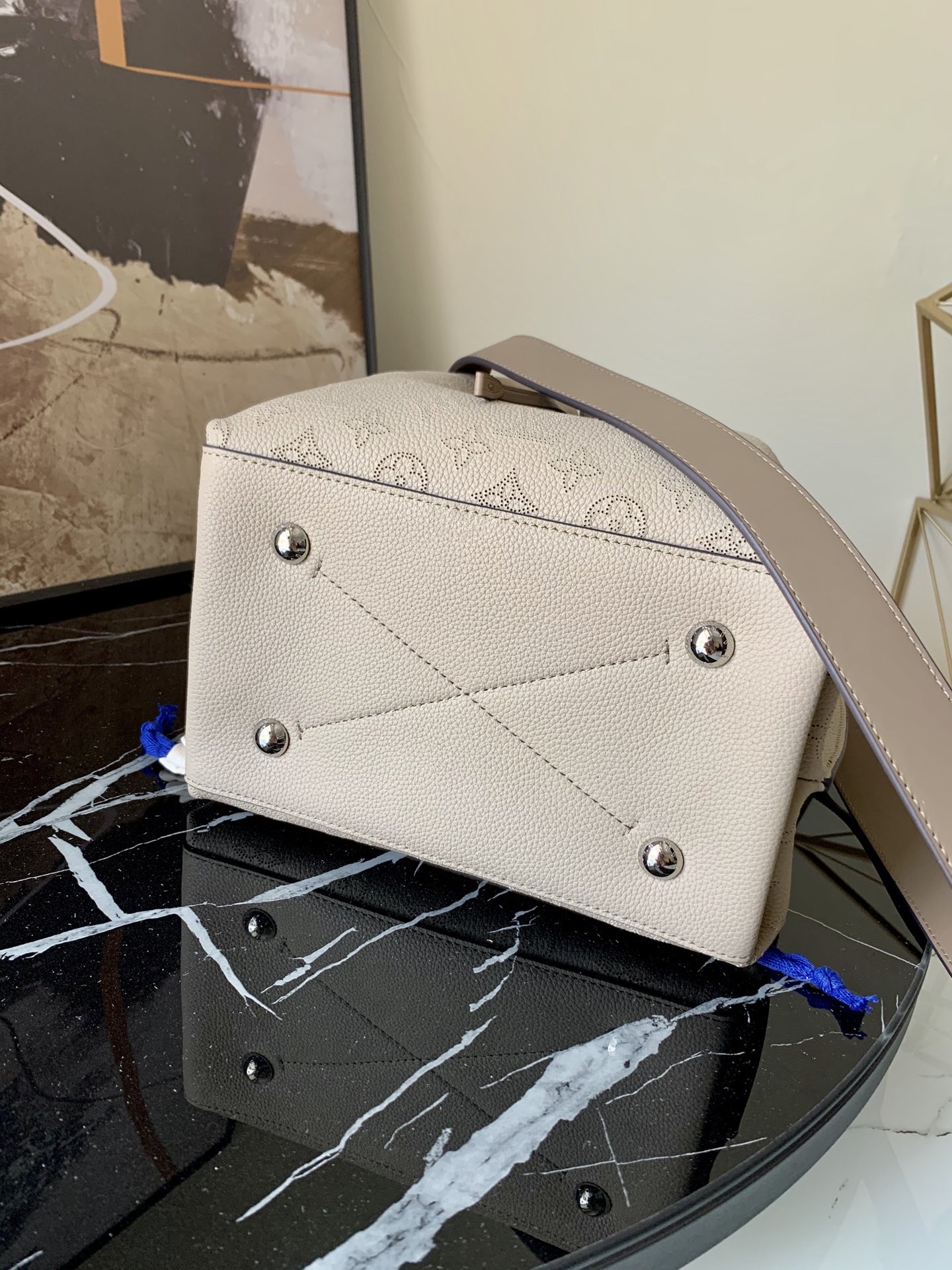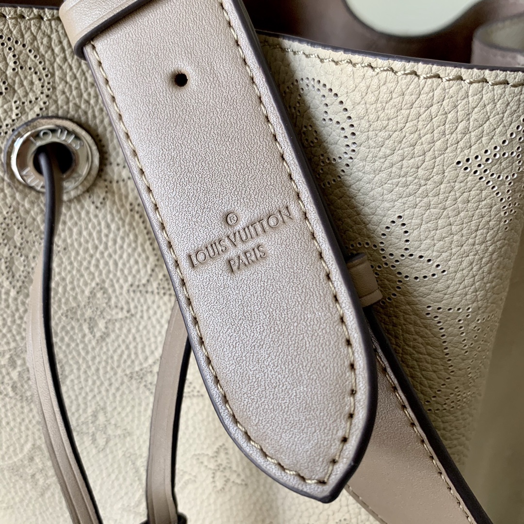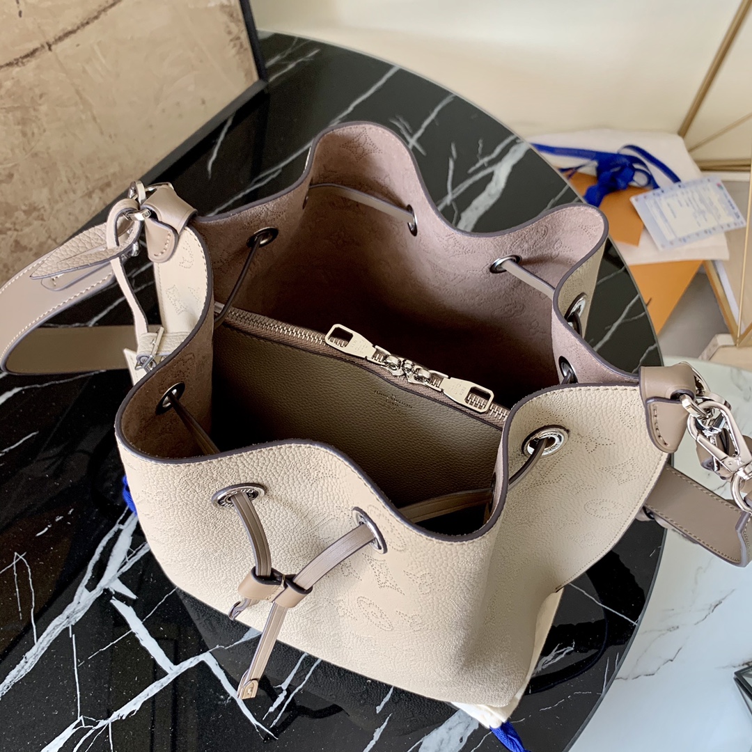 This chic shoulder bag is crafted of fine perforated mahina leather in soft beige. The shoulder bag features a pull cinch cord, optional shoulder strap, rolled top handles and polished silver hardware. The top opens to a spacious microfiber interior with a matching removable pouch perfect for all of your everyday necessities with the luxury and style only from Louis Vuitton!