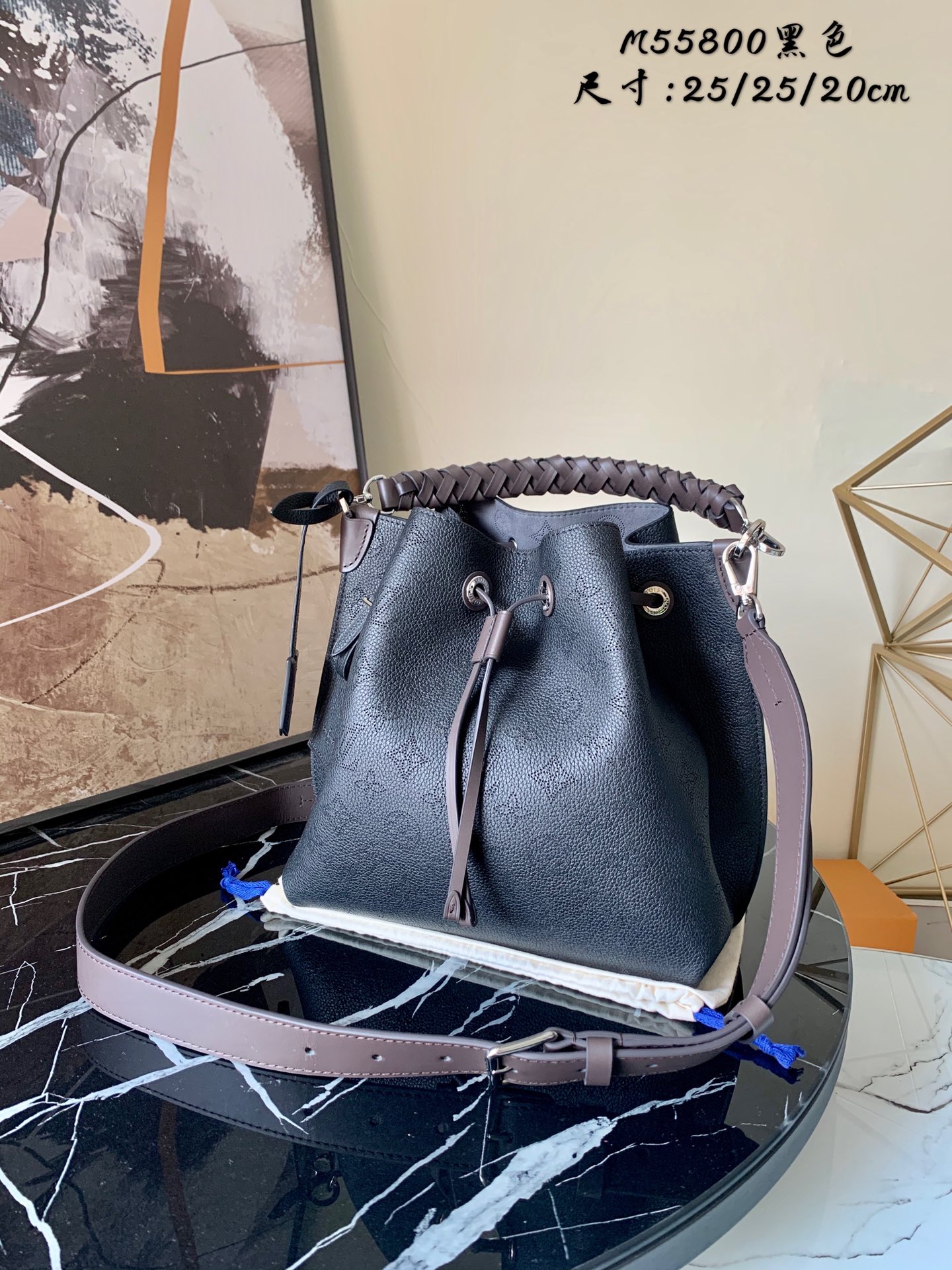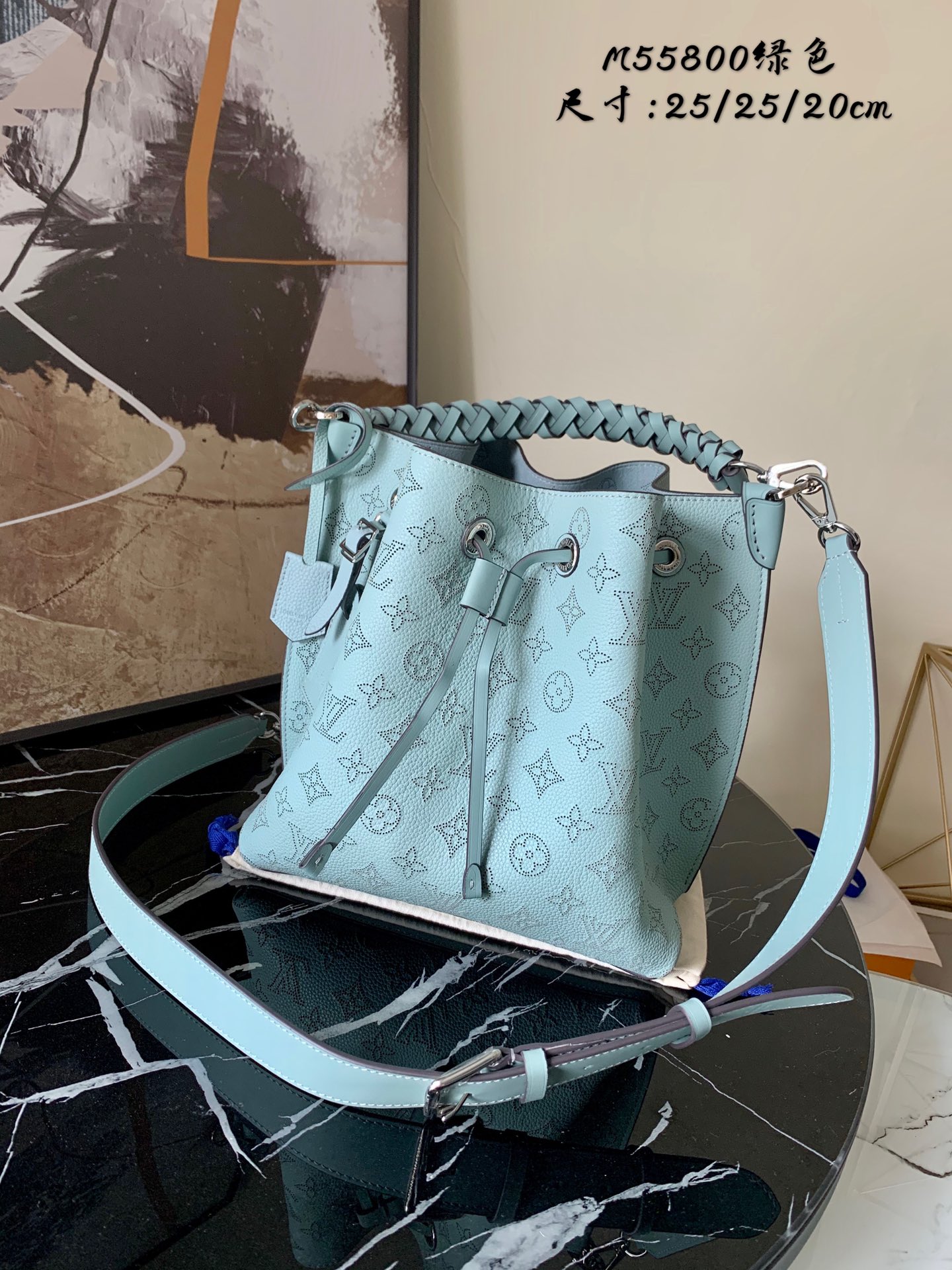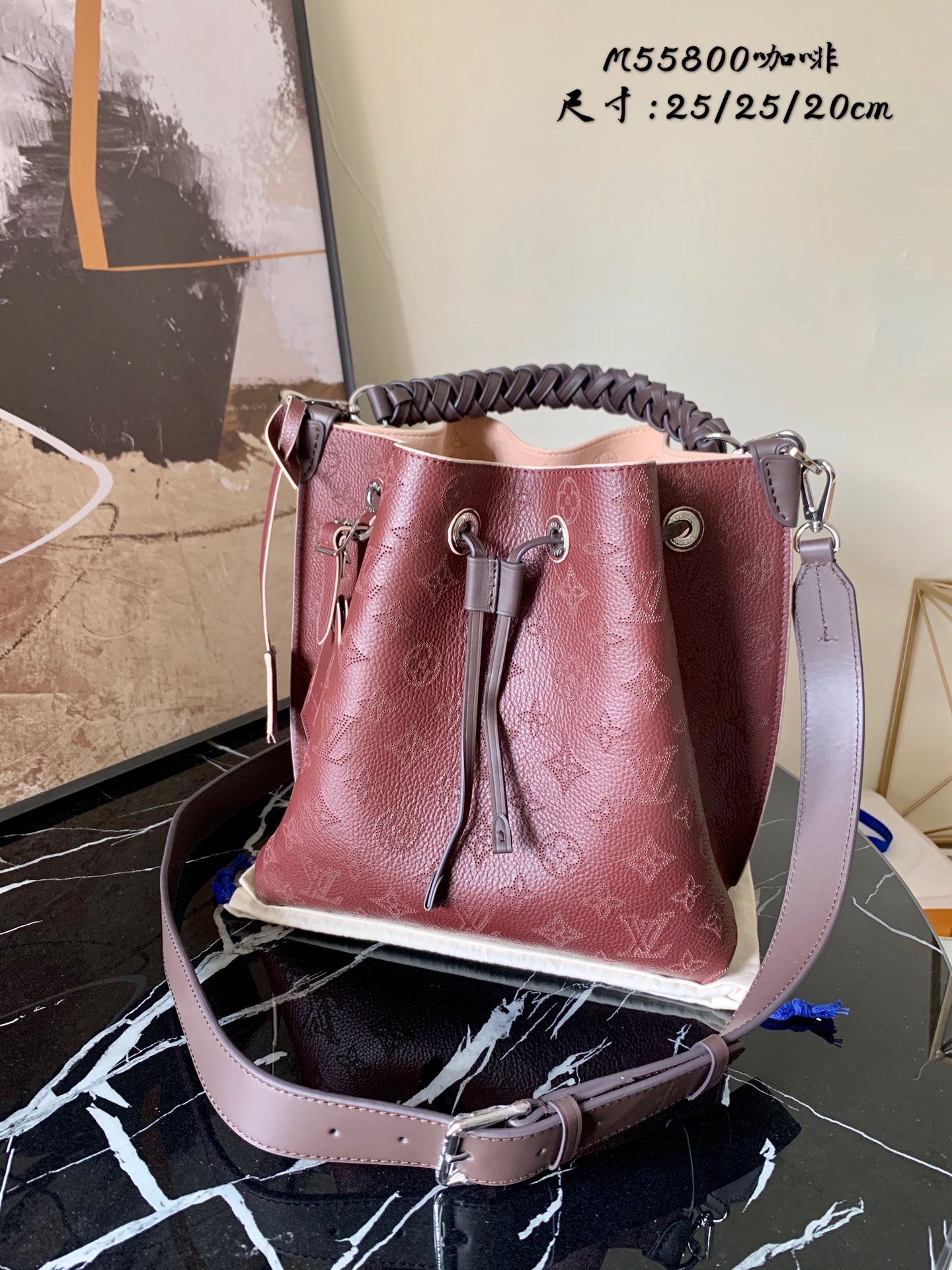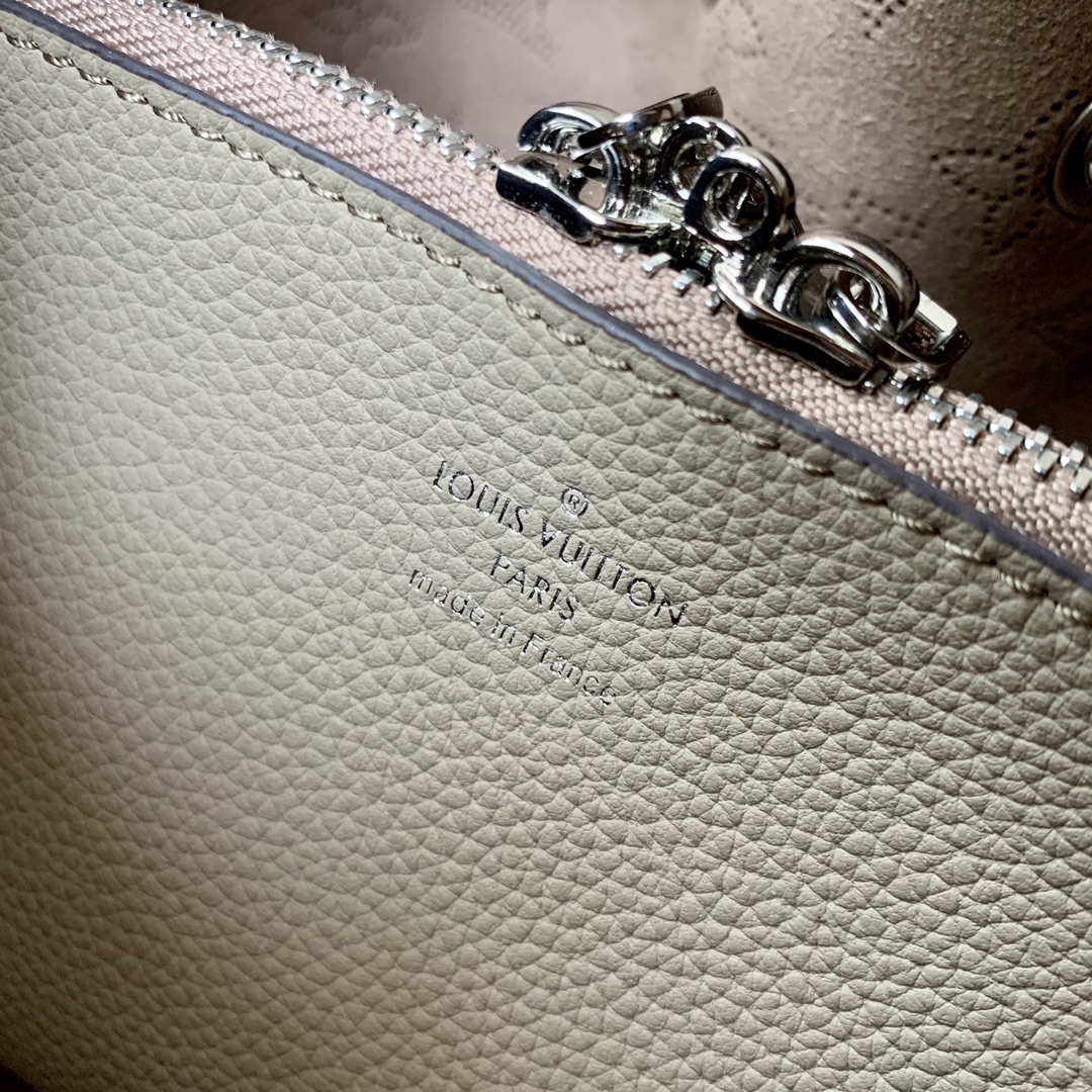 This chic shoulder bag is crafted of fine perforated mahina leather in soft beige. The shoulder bag features a pull cinch cord, optional shoulder strap, rolled top handles and polished silver hardware. The top opens to a spacious microfiber interior with a matching removable pouch perfect for all of your everyday necessities with the luxury and style only from Louis Vuitton!