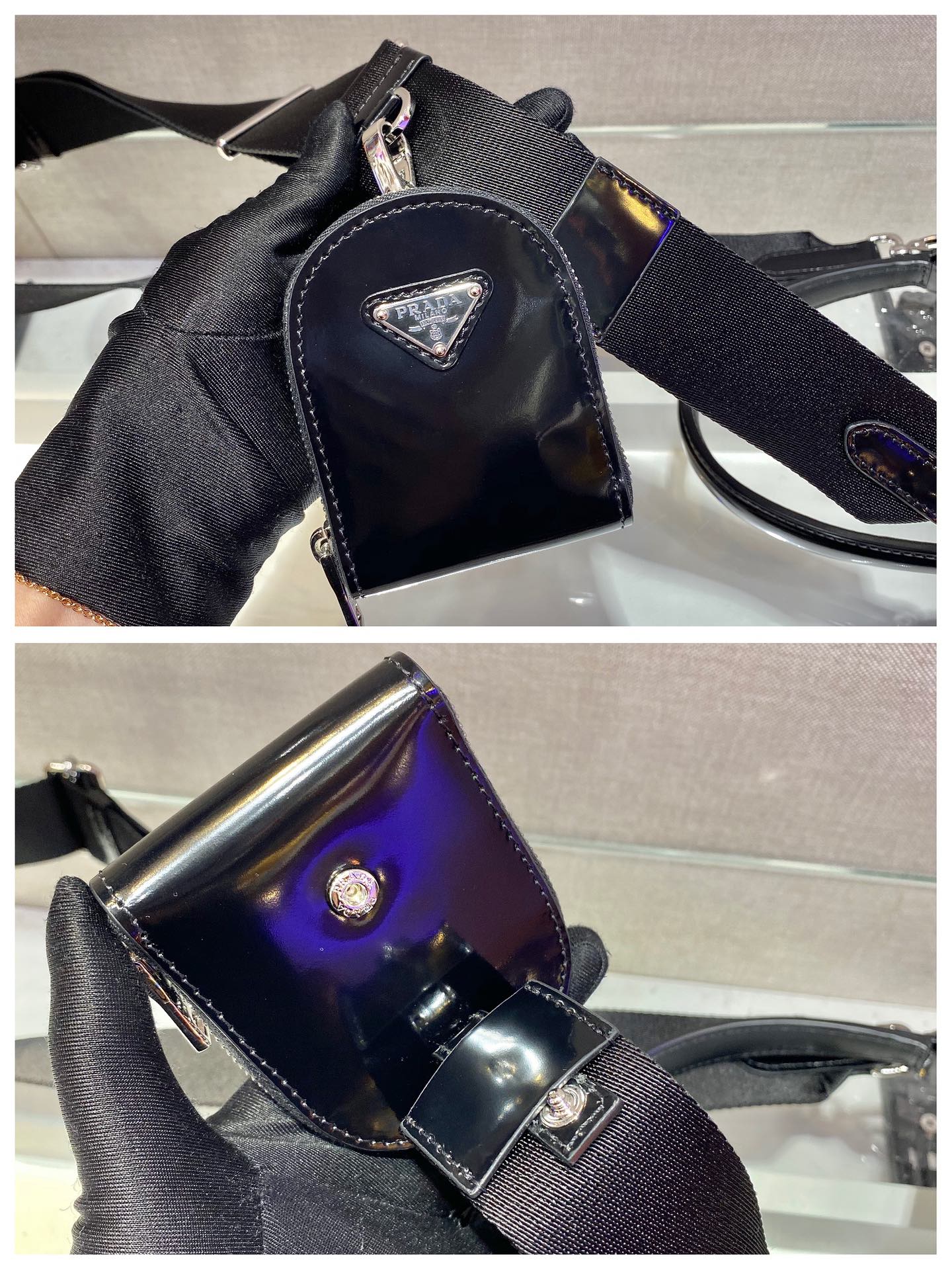 Brushed Leather Tote Bag by Prada: black Brushed Leather Tote Bag with round leather handle, logo on triangle in enamelled metal on the front, adjustable and removable shoulder strap in logoed tape, removable leather necessaire with zip closure, silver-colored metal finishes, base with metal feet, leather interior with double compartment and one slot pocket