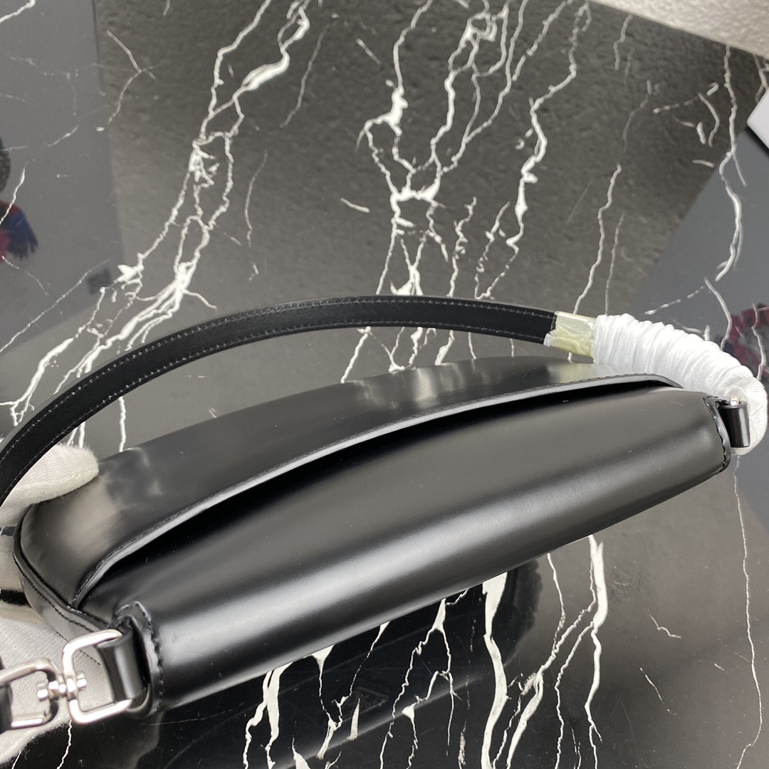 The Prada Cleo bag with sophisticated allure reinterprets an iconic design of the brand from the 1990's. Sleek curved lines emphasized by the particular construction rounded on the bottom and sides give this flap bag a soft, light look. Brushed leather, a modern and versatile material that is distinctive in Prada collections, is ideal for creating always new combinations and contrasts. The enamel triangle logo decorates the silhouette.