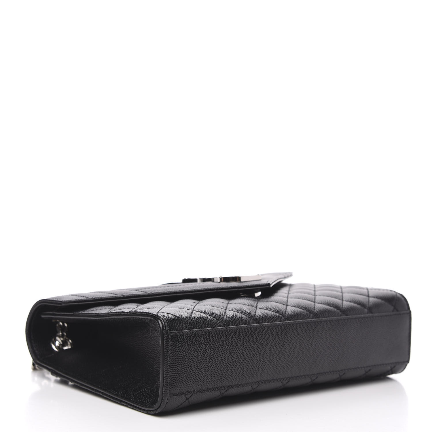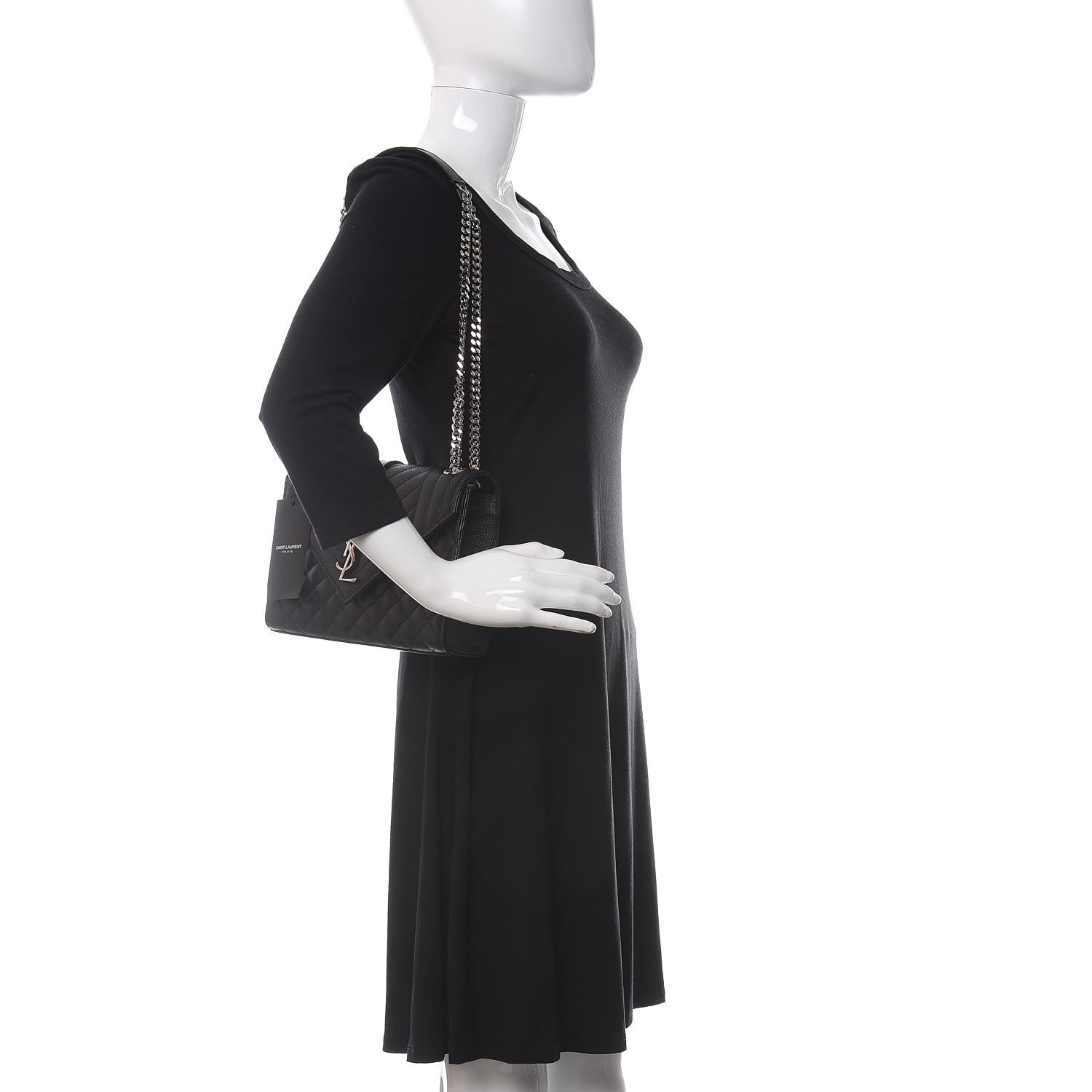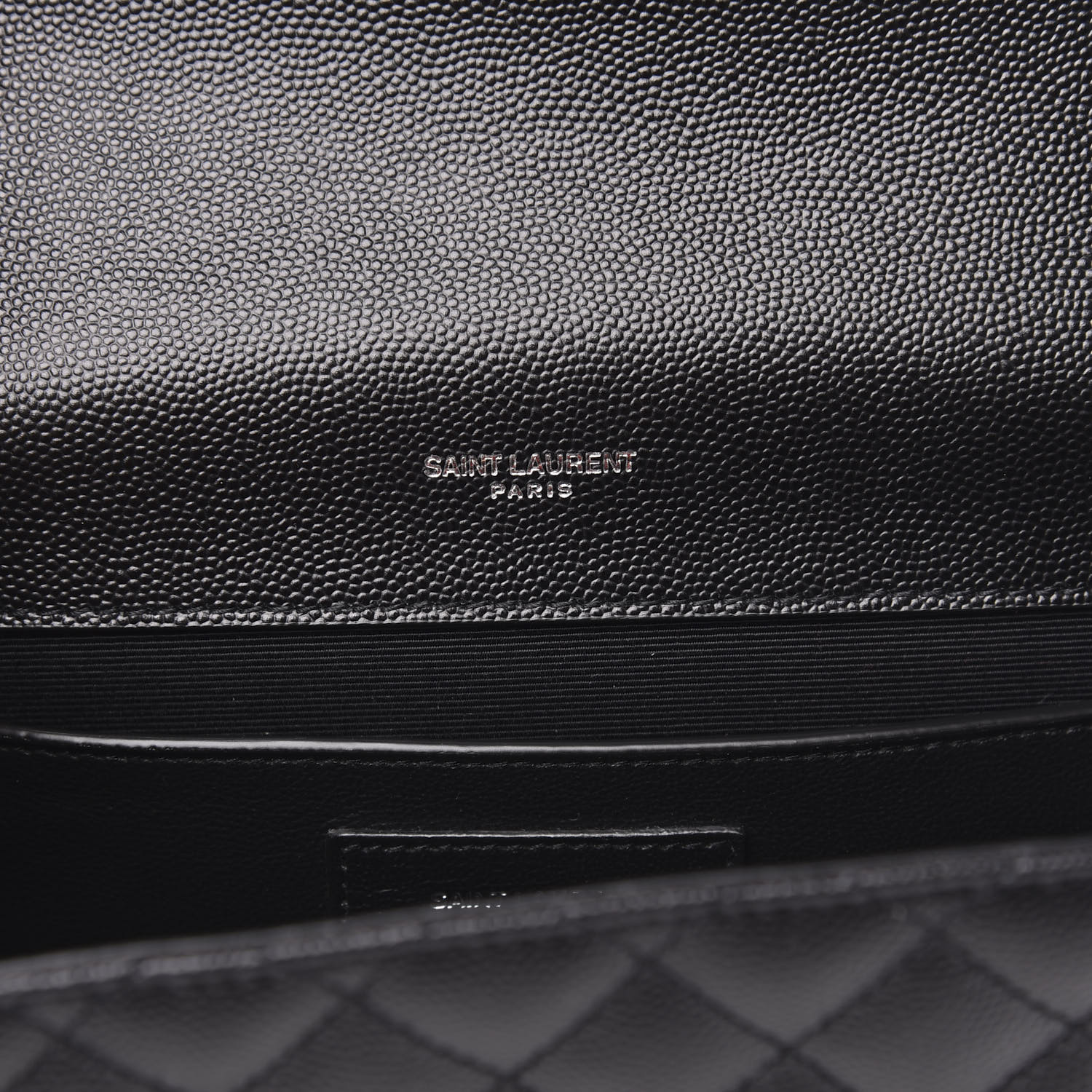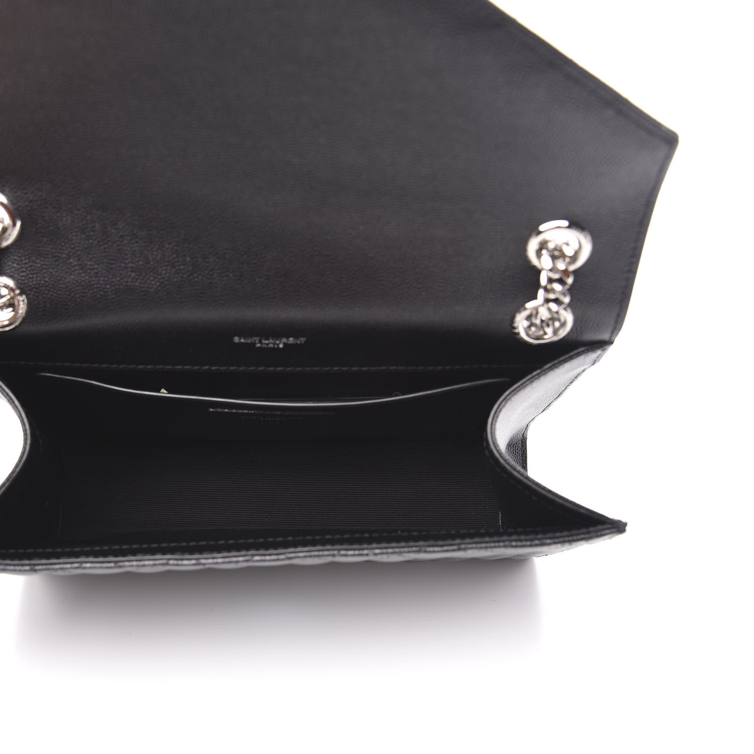 This elegant shoulder bag is crafted of grained leather in black with chevron, linear, and diamond quilting. The bag features a large exterior flat pocket, silver chain-link shoulder straps with leather shoulder pads and an envelope style flap with a silver YSL monogram closure. This opens with a magnetic snap to a black fabric interior with a patch pocket. This is an ideal bag for day or evening, with the classic chic of Saint Laurent!