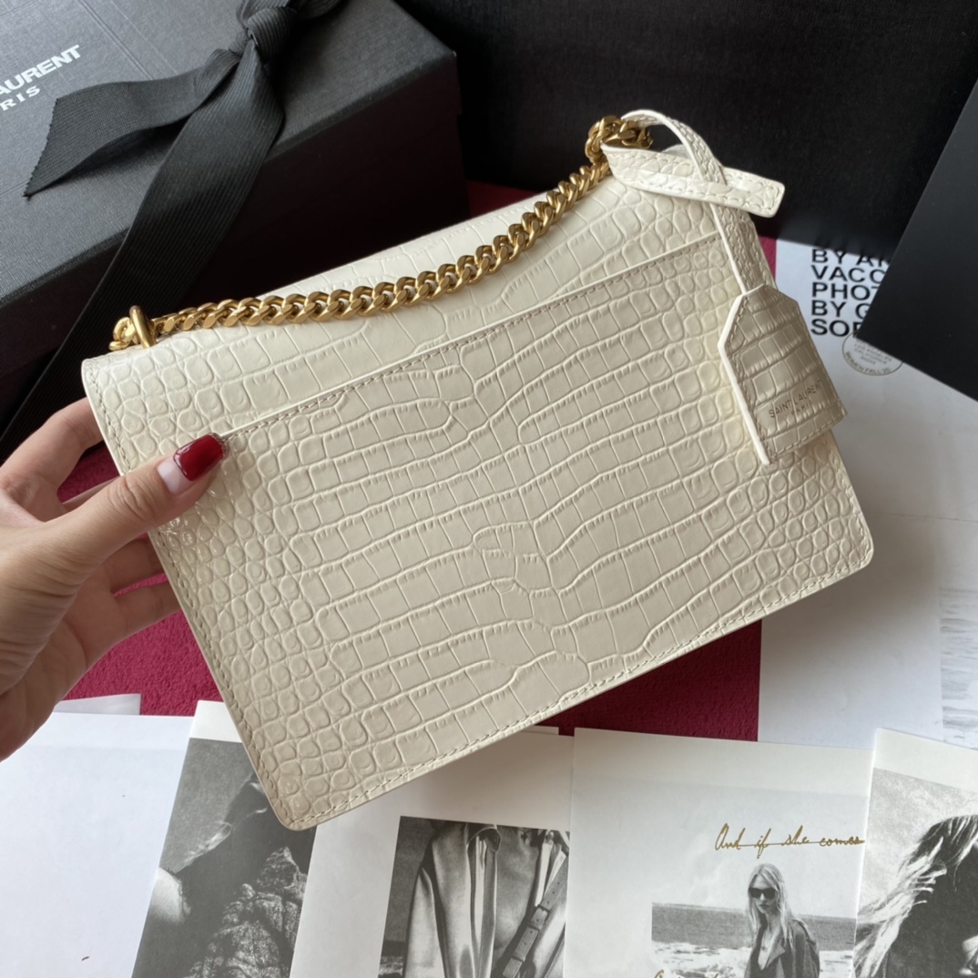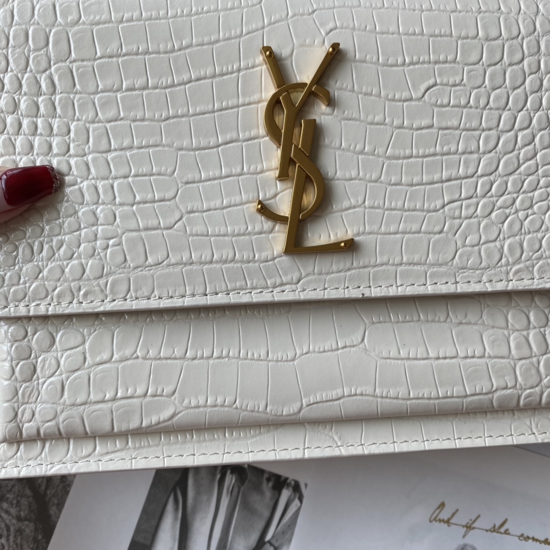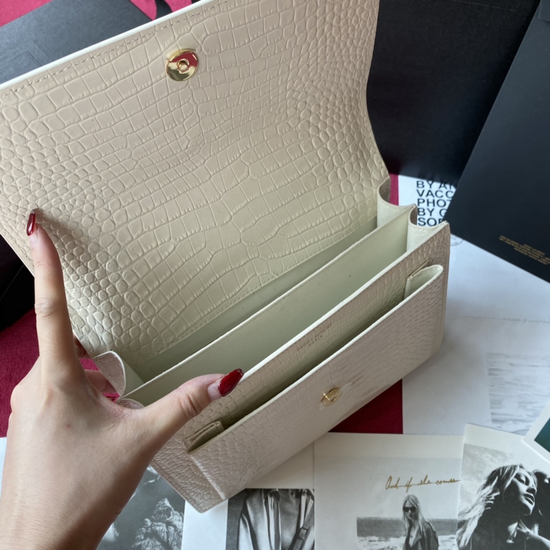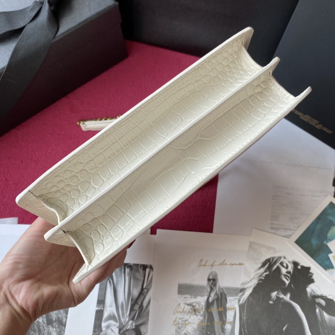 YSL Calfskin Crocodile Embossed Monogram Sunset Chain Wallet Blanc Vintage