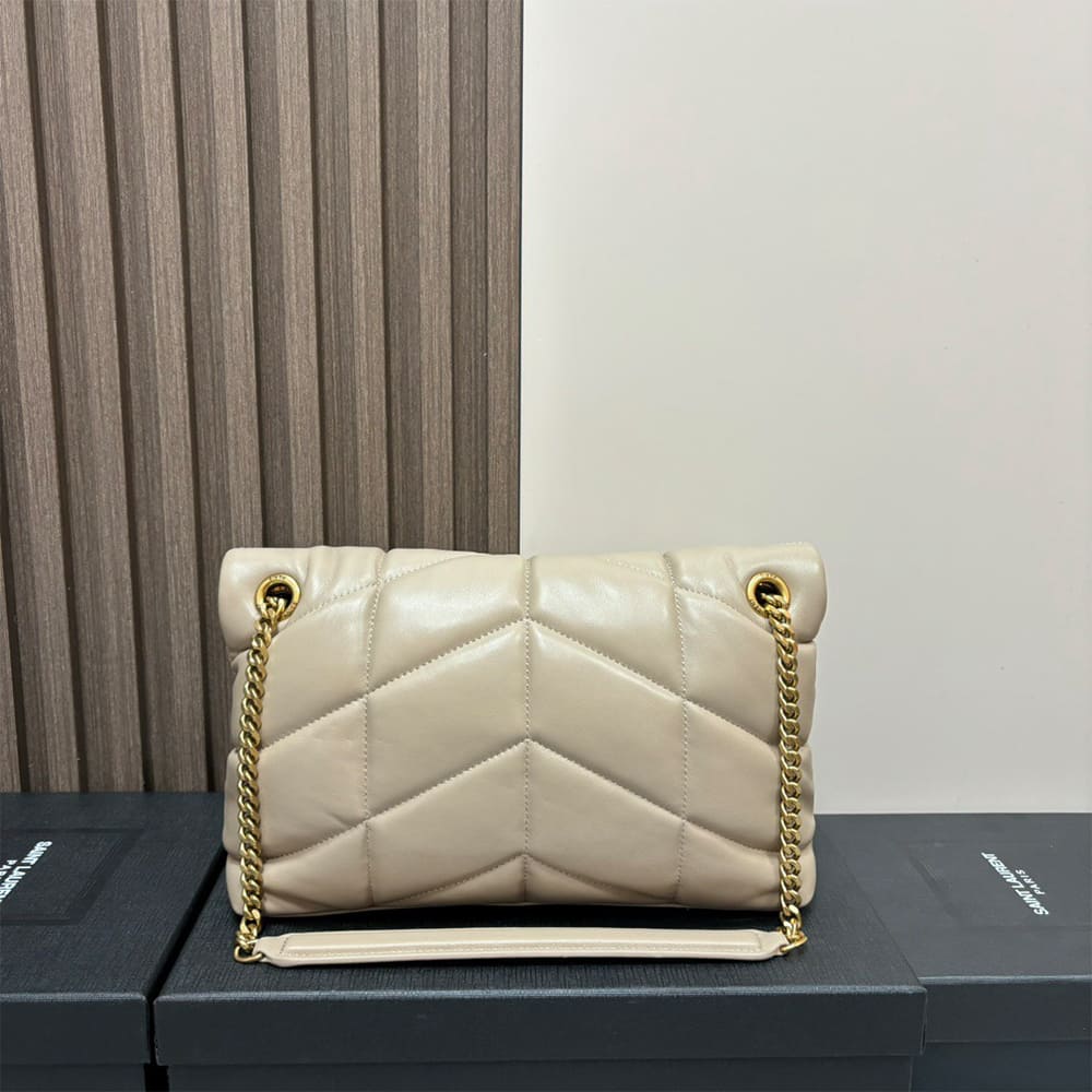 The Saint Laurent YSL Puffer Small is a chic and modern shoulder bag crafted from soft, luxurious nappa leather with signature chevron quilting. Featuring the iconic YSL monogram and a smooth magnetic flap closure, it blends elegance with everyday practicality.