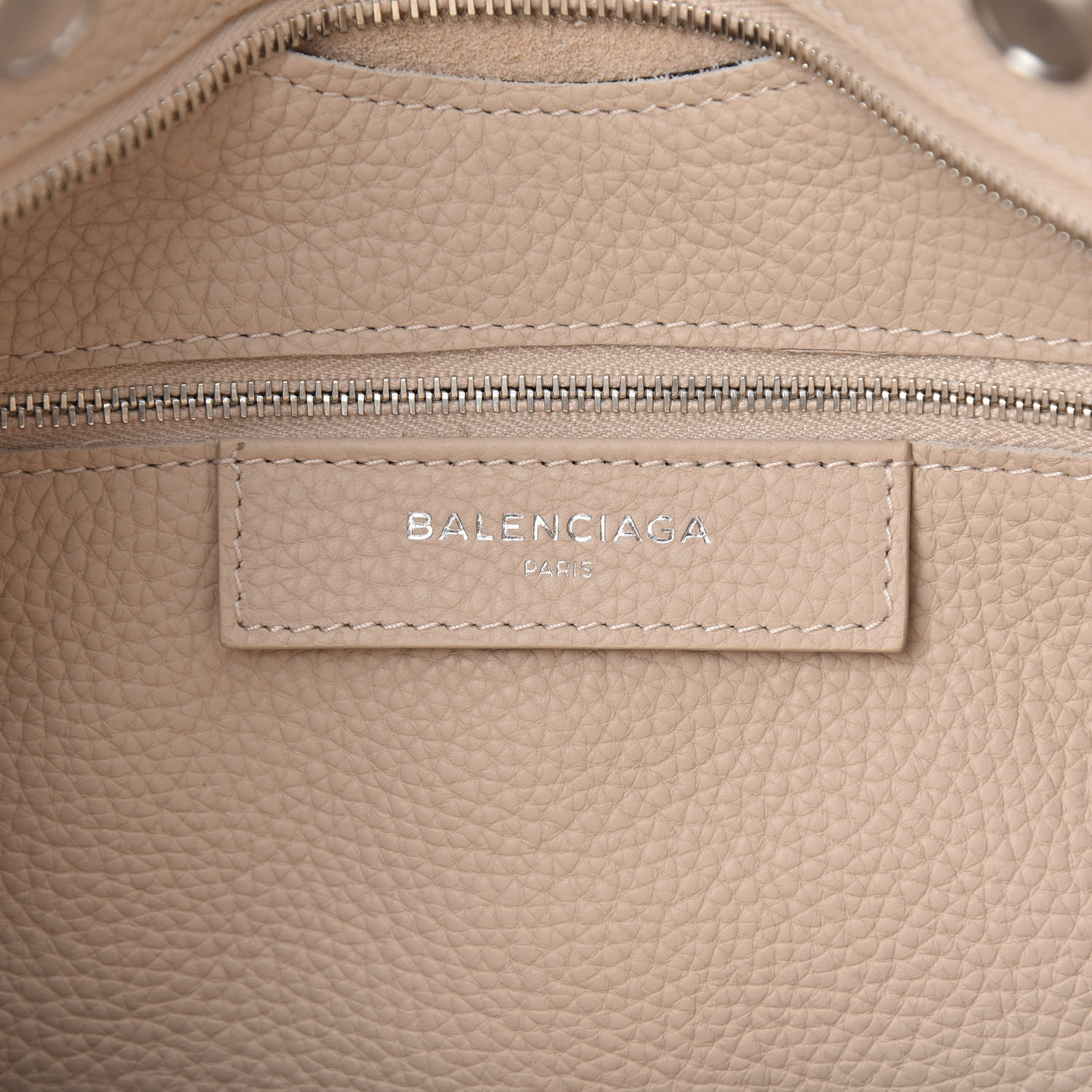 This chic tote is crafted of textured calfskin leather in beige. The bag features rolled leather top handles and an optional shoulder strap. The face and back of the bag is complemented with perforated faux facing zipper pocket and belts with brass hardware. The top zipper opens to a spacious leather interior with zipper and patch pockets. This is an excellent tote, ideal for everyday use, with the distinctive style of Balenciaga!